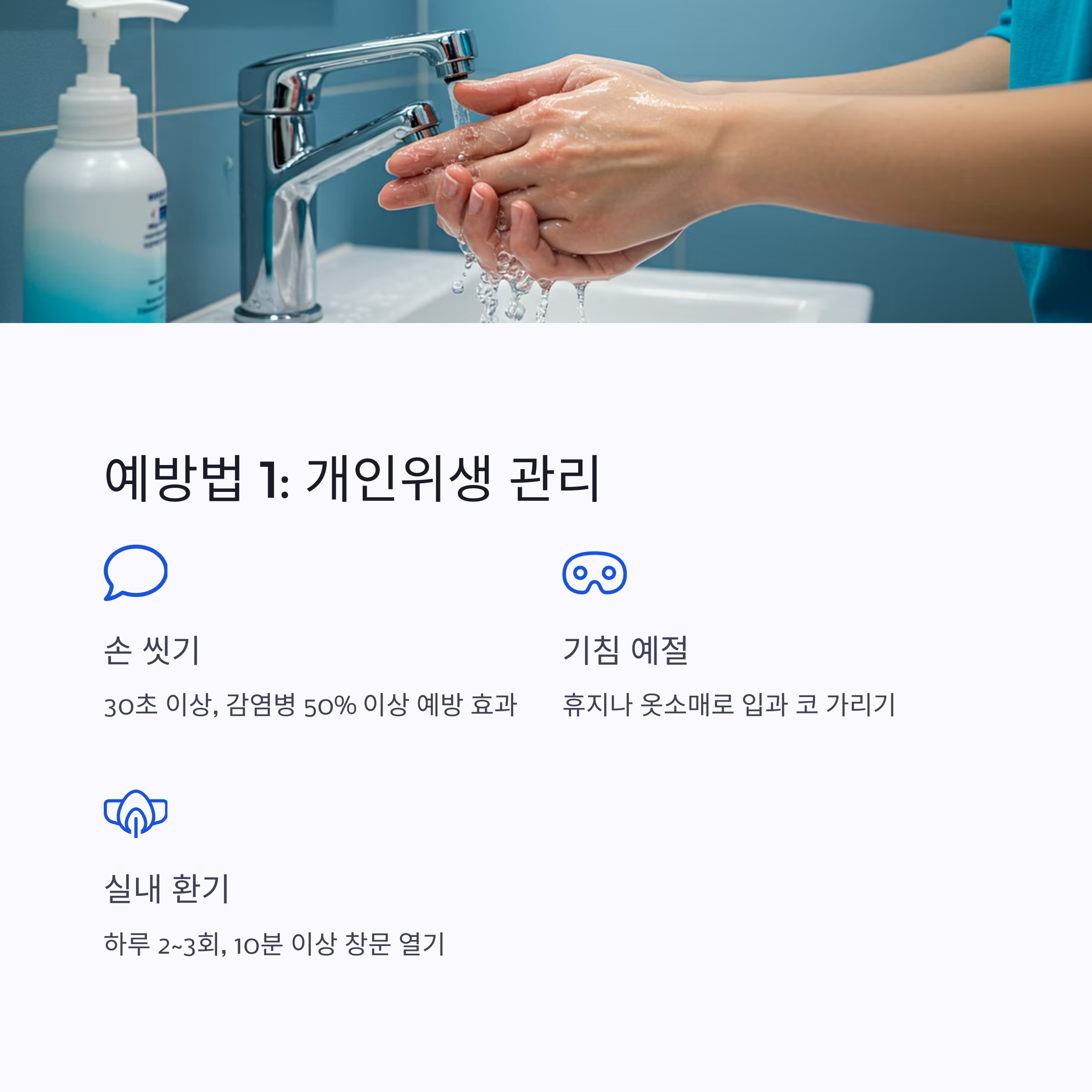 | 실내 환기 | 하루 2~3회, 10분 이상 | 집단감염 예방에 필수 |