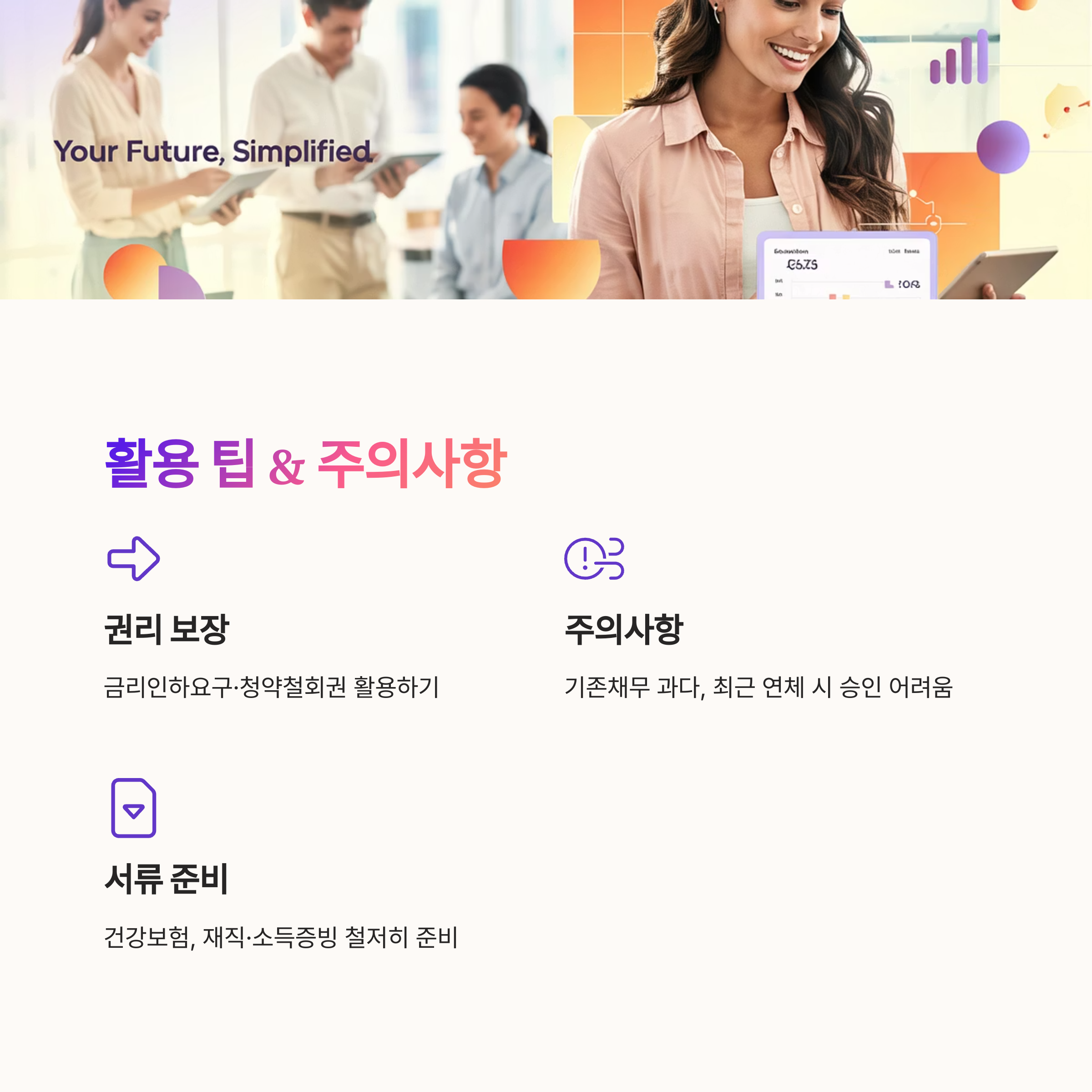 - 다만, 모든 대출과 마찬가지로 본인의 상환 능력을 정확히 파악하고 계획적인 상환 계획을 세우는 것이 중요합니다.