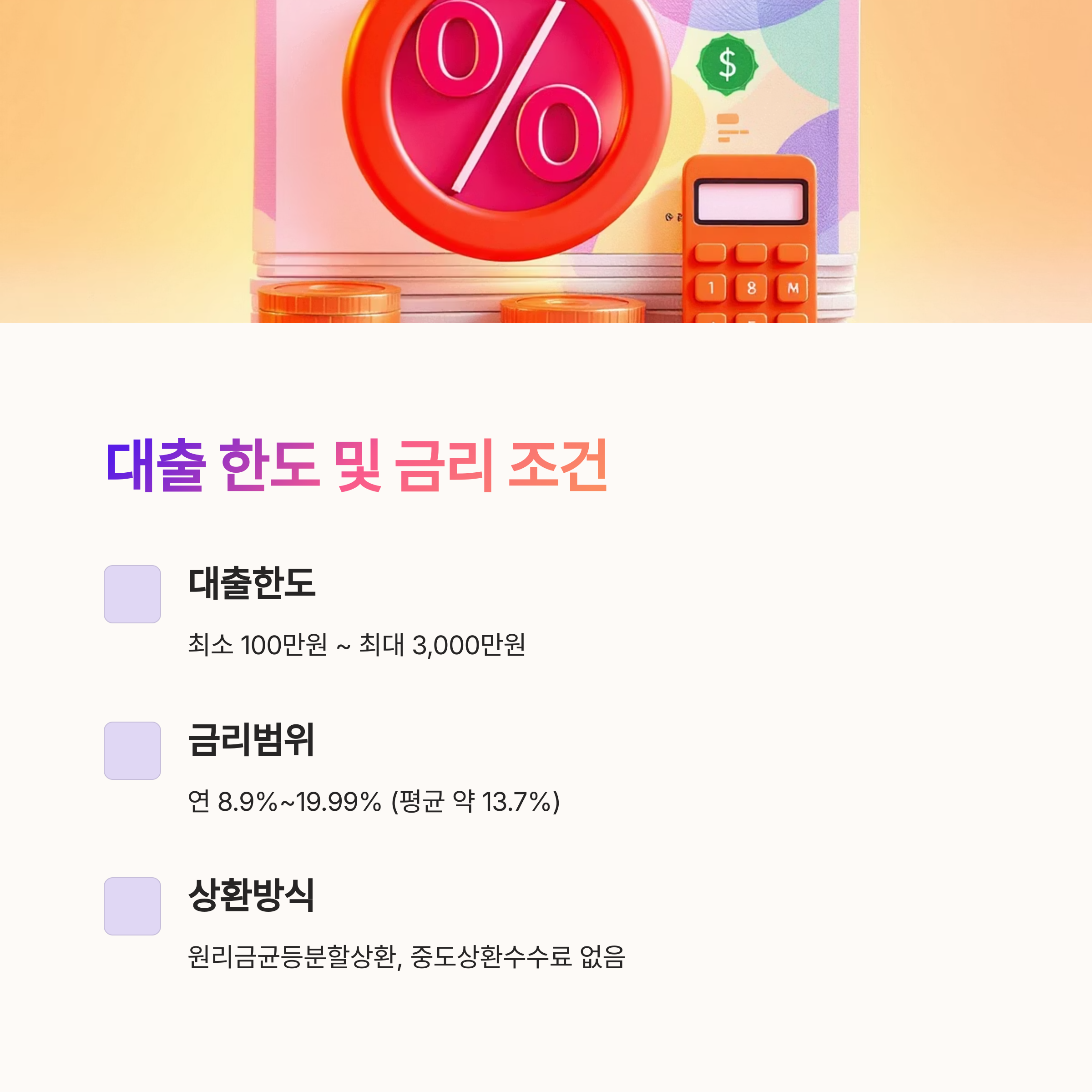 | 대출 한도 | 최소 100만원 ~ 최대 3,000만원(개인별 차등) |