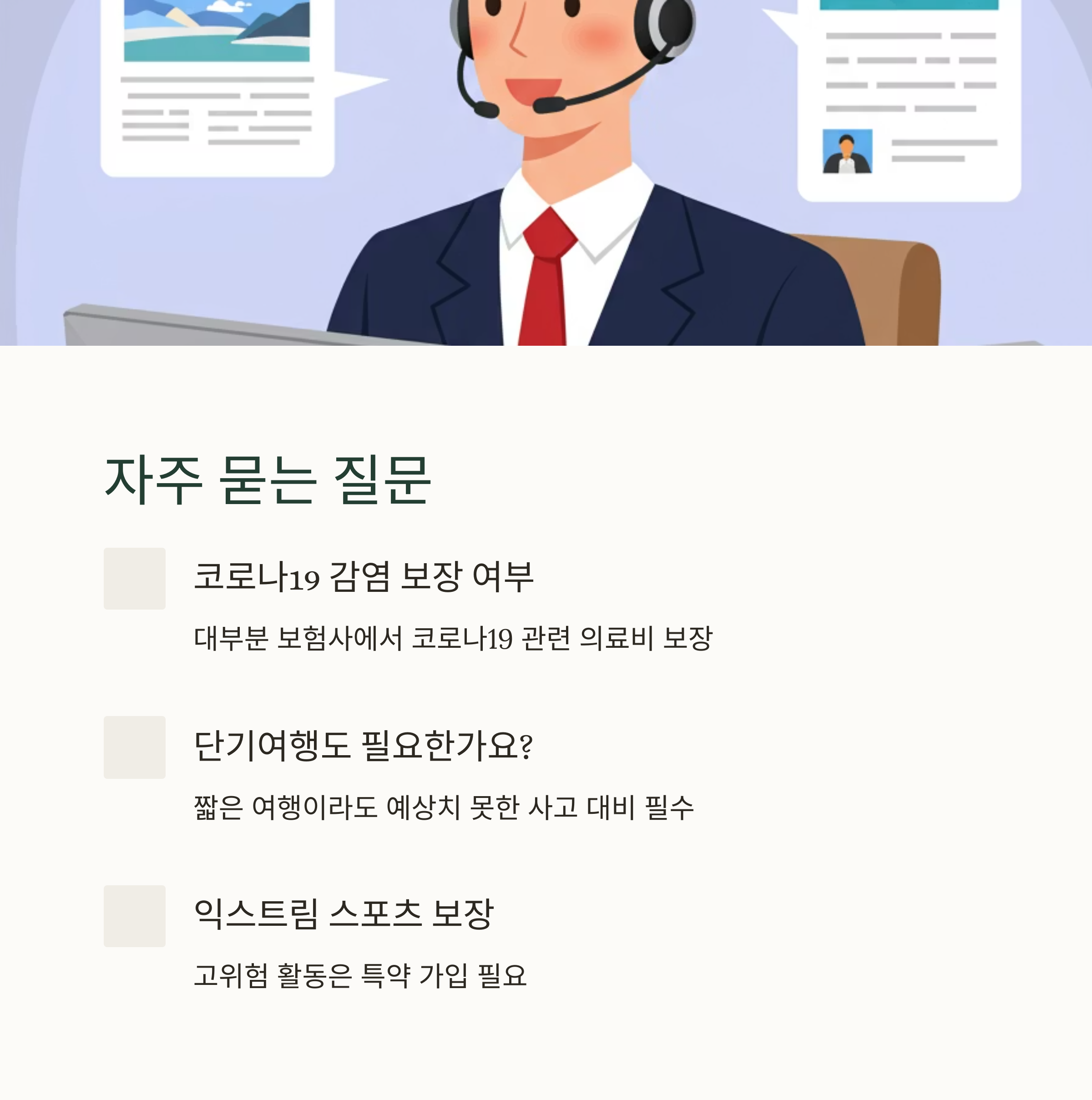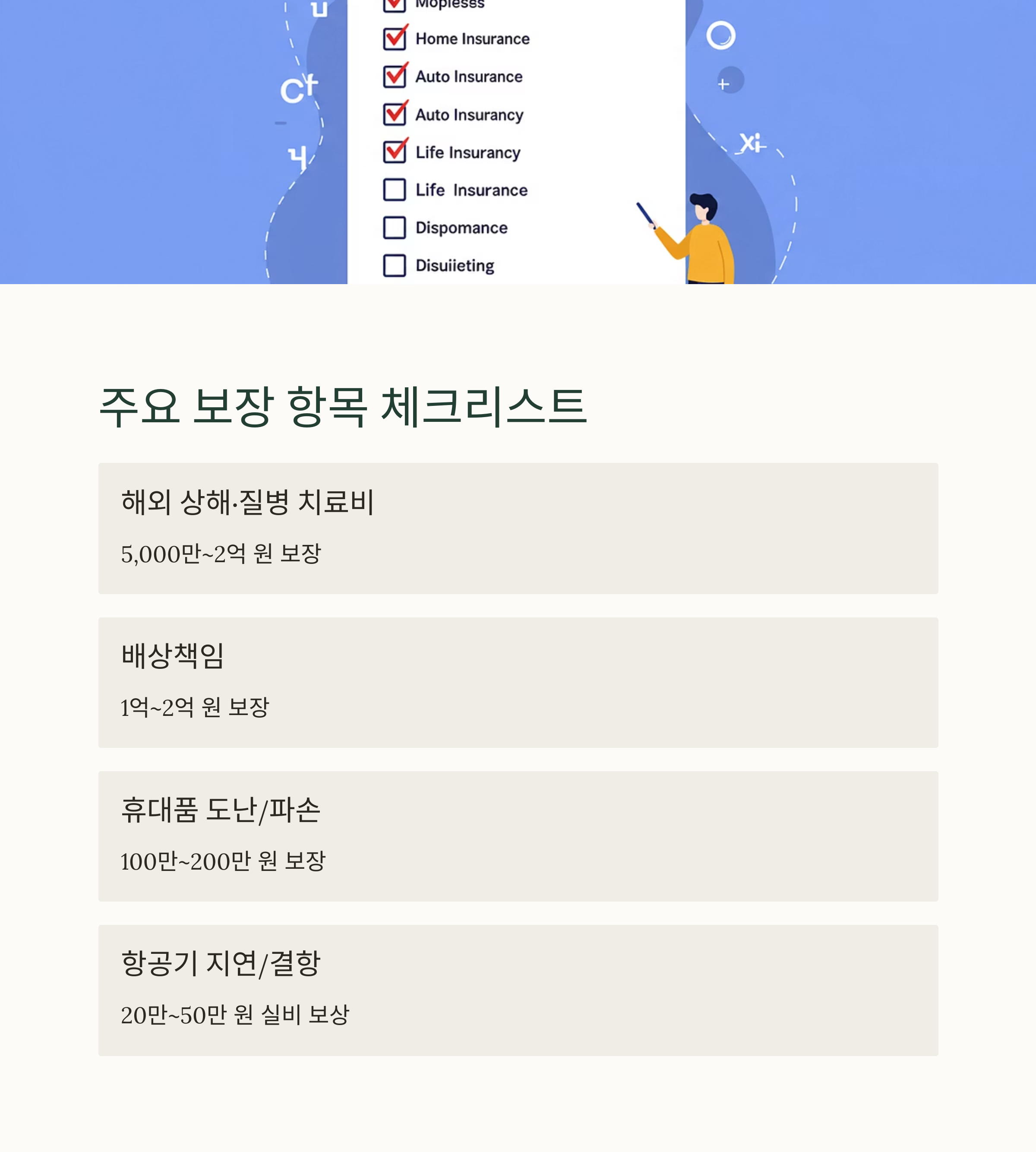 - 여행 목적(레저, 비즈니스, 장기, 단기 등)에 맞는 상품을 선택하세요. 액티비티 여행을 계획 중이라면 익스트림 스포츠 등 고위험 활동이 보장되는지 반드시 확인해야 합니다.