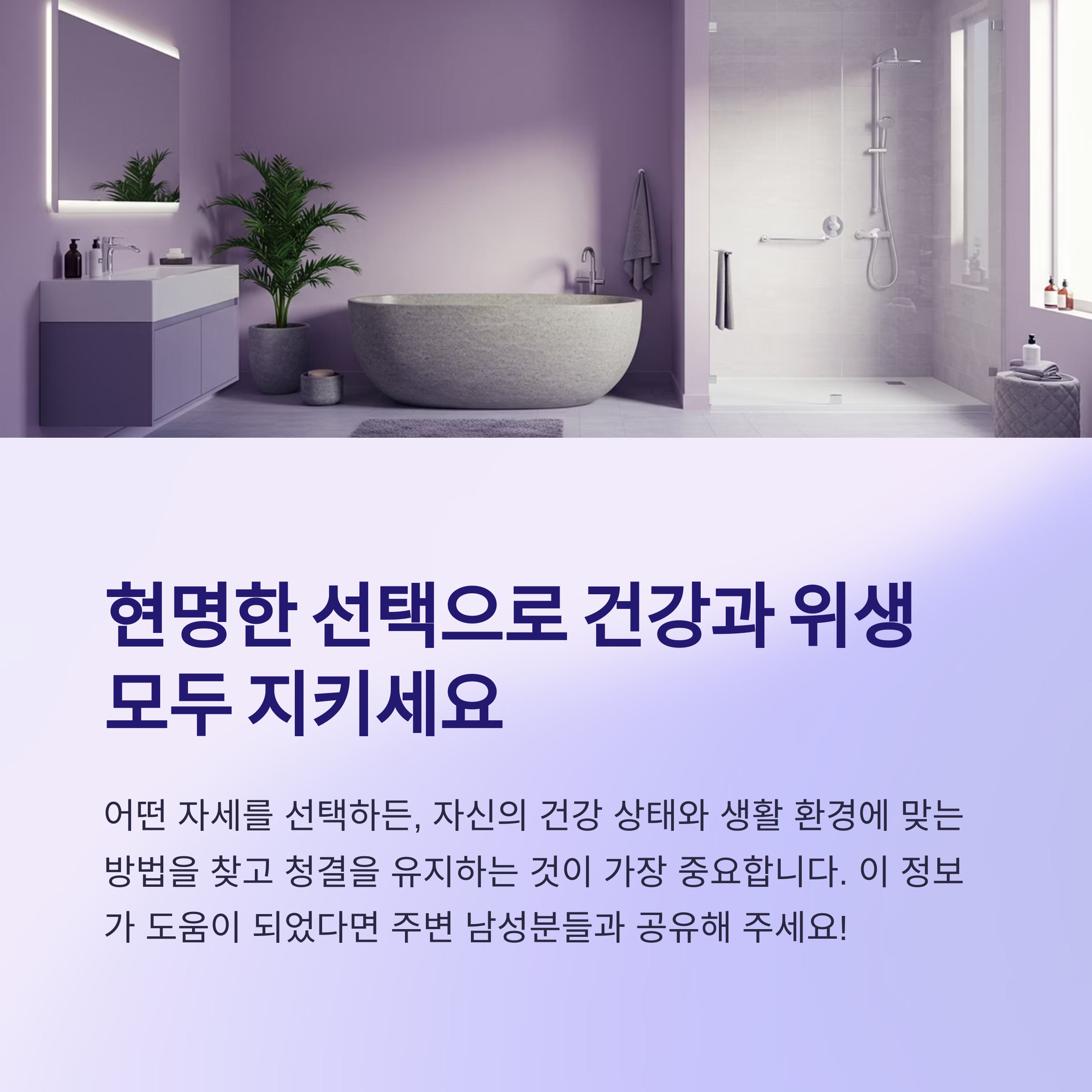 어떤 자세를 선택하든, 가장 중요한 건 자신의 몸과 생활 환경에 가장 적합한 방법을 찾고, 늘 청결을 유지하는 것 아닐까 싶어요. 이 글이 여러분의 현명한 선택에 조금이나마 도움이 되었으면 좋겠습니다! 혹시 더 궁금한 점이 있다면 언제든지 댓글로 물어봐주세요~