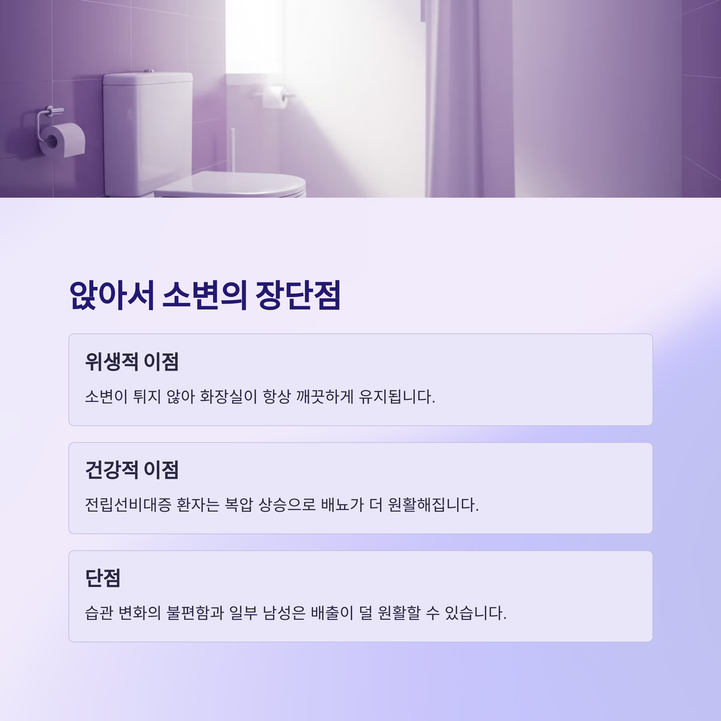 - 장점: 화장실 위생적 (소변 튐 없음), 가족 배려, 전립선 비대증 환자 배뇨 원활