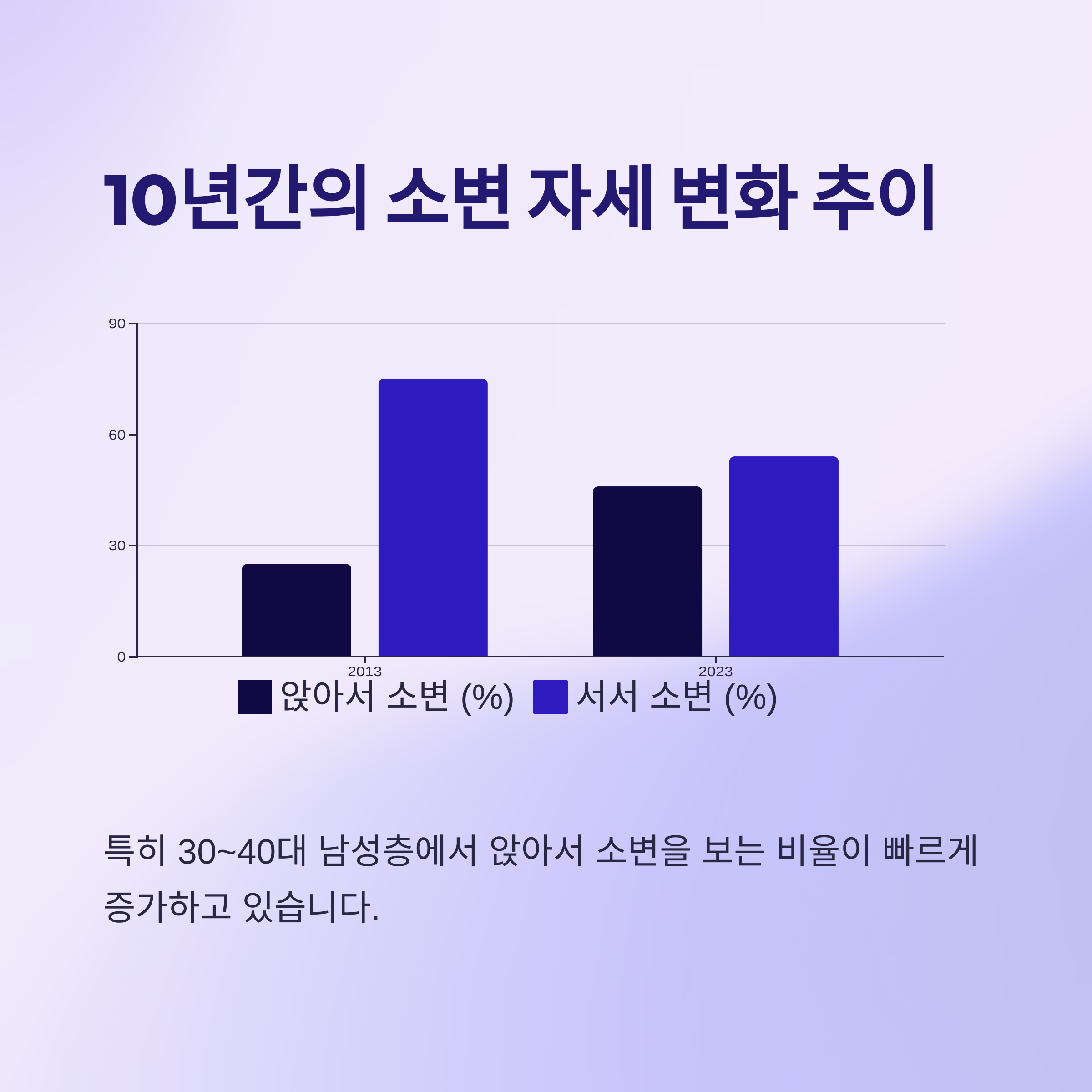 - 보이시죠? 10년 새 ‘앉아서 소변’ 비율이 거의 2배 가까이 증가했다는 사실! 이건 정말 중요한 트렌드입니다.
