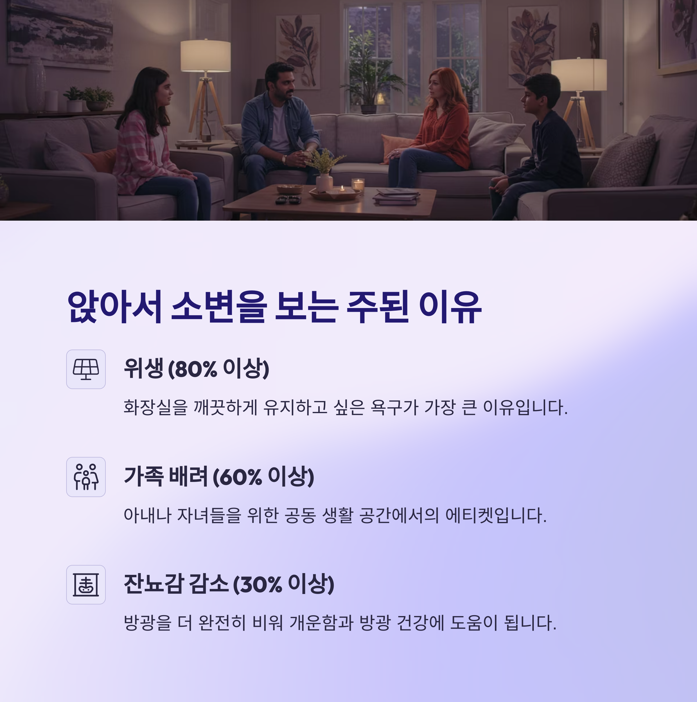 - 공동생활 환경: 앉아서 소변 (위생적, 악취/오염 감소)