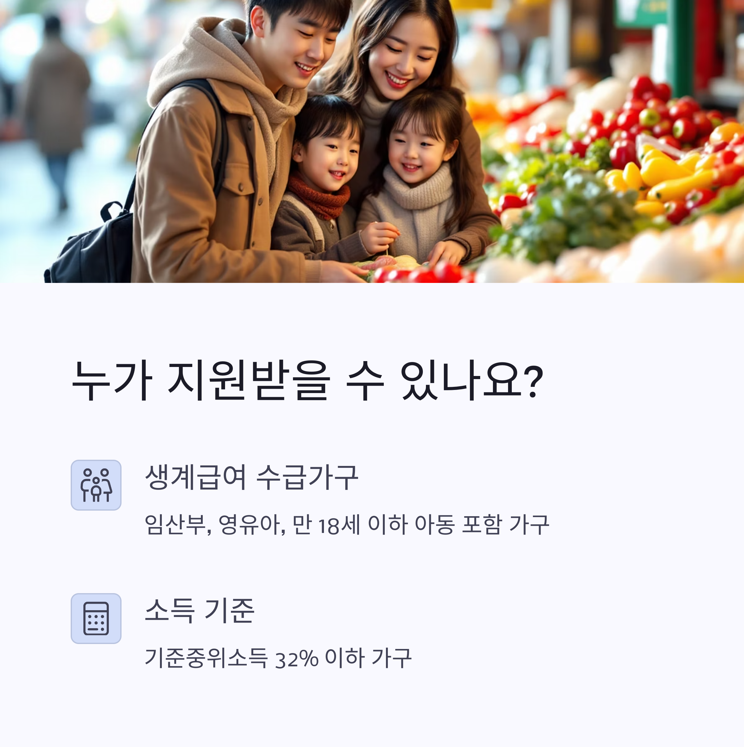 | 특성 기준 | 가구원 중 임산부, 영유아, 초·중·고등학생(만 18세 이하) 포함 |