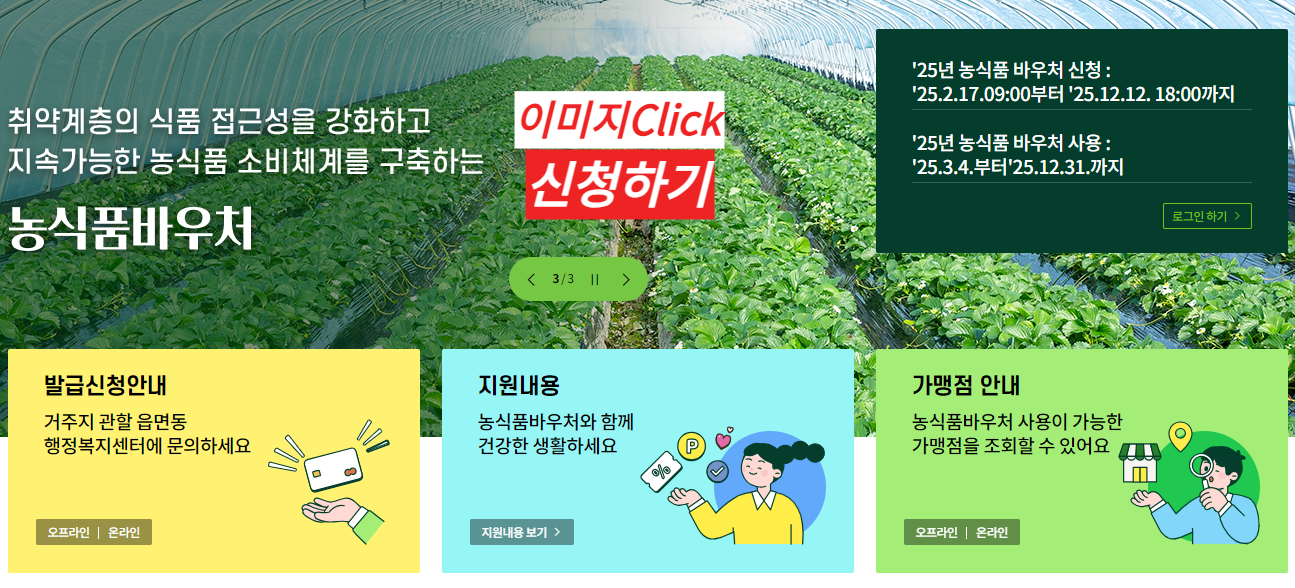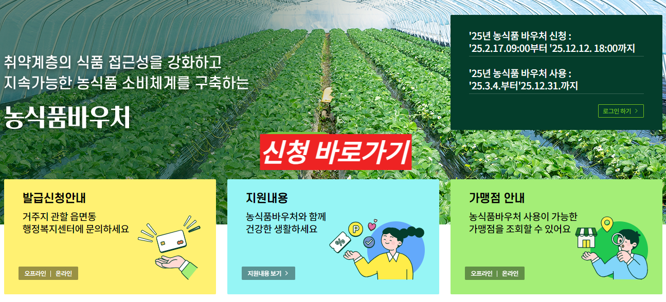 | 공식 홈페이지 | 농식품품 바우처 홈페이지 www.foodvoucher.go.kr에서 신청 |