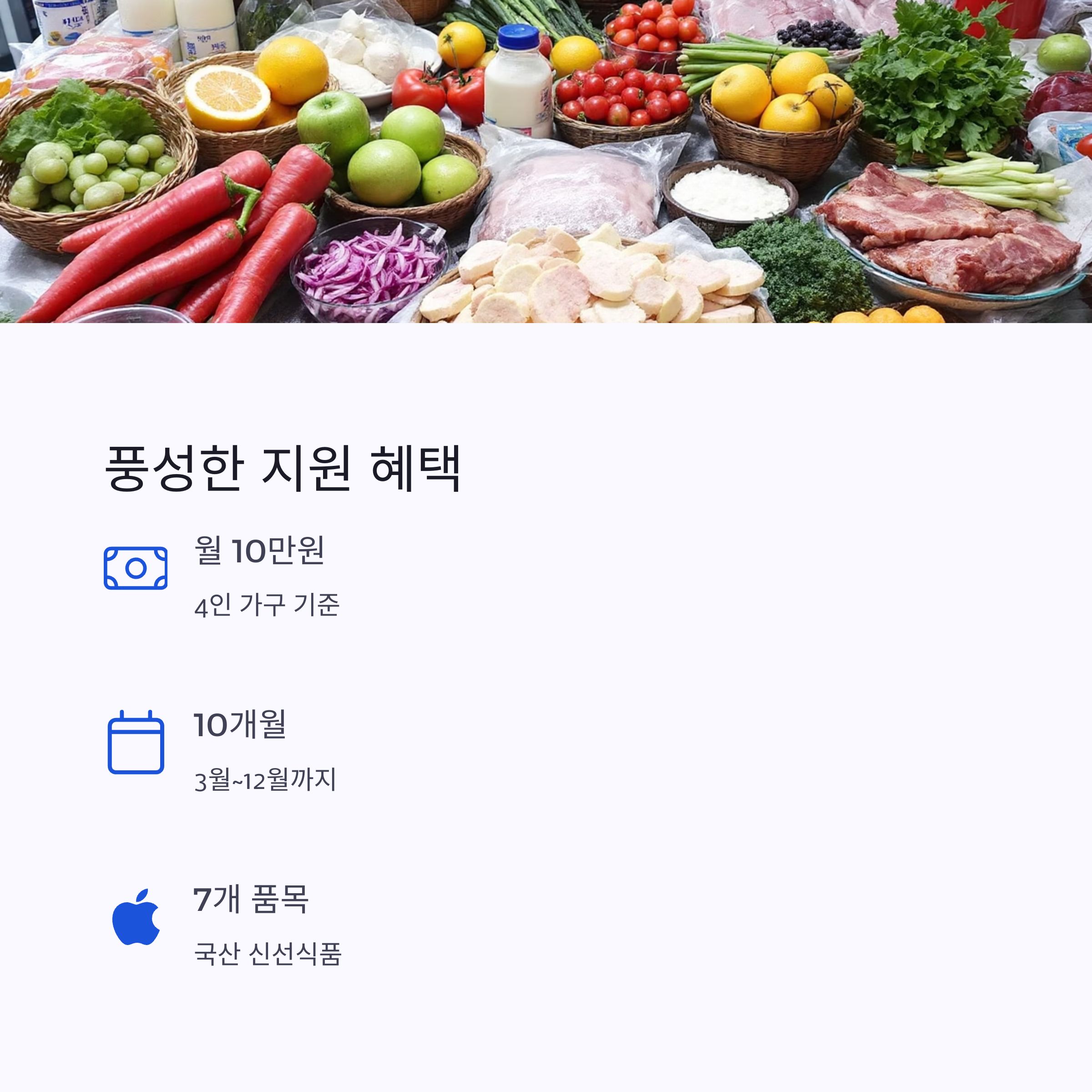 | 지원 대상 여부는 어떻게 확인하나요? | 읍·면·동 행정복지센터 또는 농식품 바우처 홈페이지에서 확인 가능합니다. |