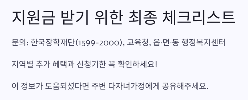 다자녀 지원금은 신청 절차와 서류가 까다로울 수 있어 아래 체크리스트를 활용하면 누락 없이 혜택을 받는 데 도움이 됩니다.