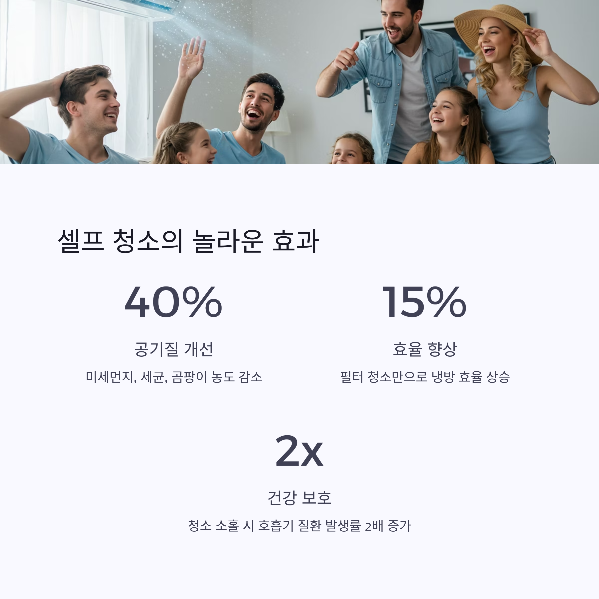 - 건강 위험 감소: 의료기관 통계에 따르면, 에어컨 청소를 소홀히 할 경우 호흡기 질환 발생률이 2배 이상 증가한다고 합니다. 꾸준한 청소는 우리 가족의 건강을 지키는 가장 쉬운 방법이에요.