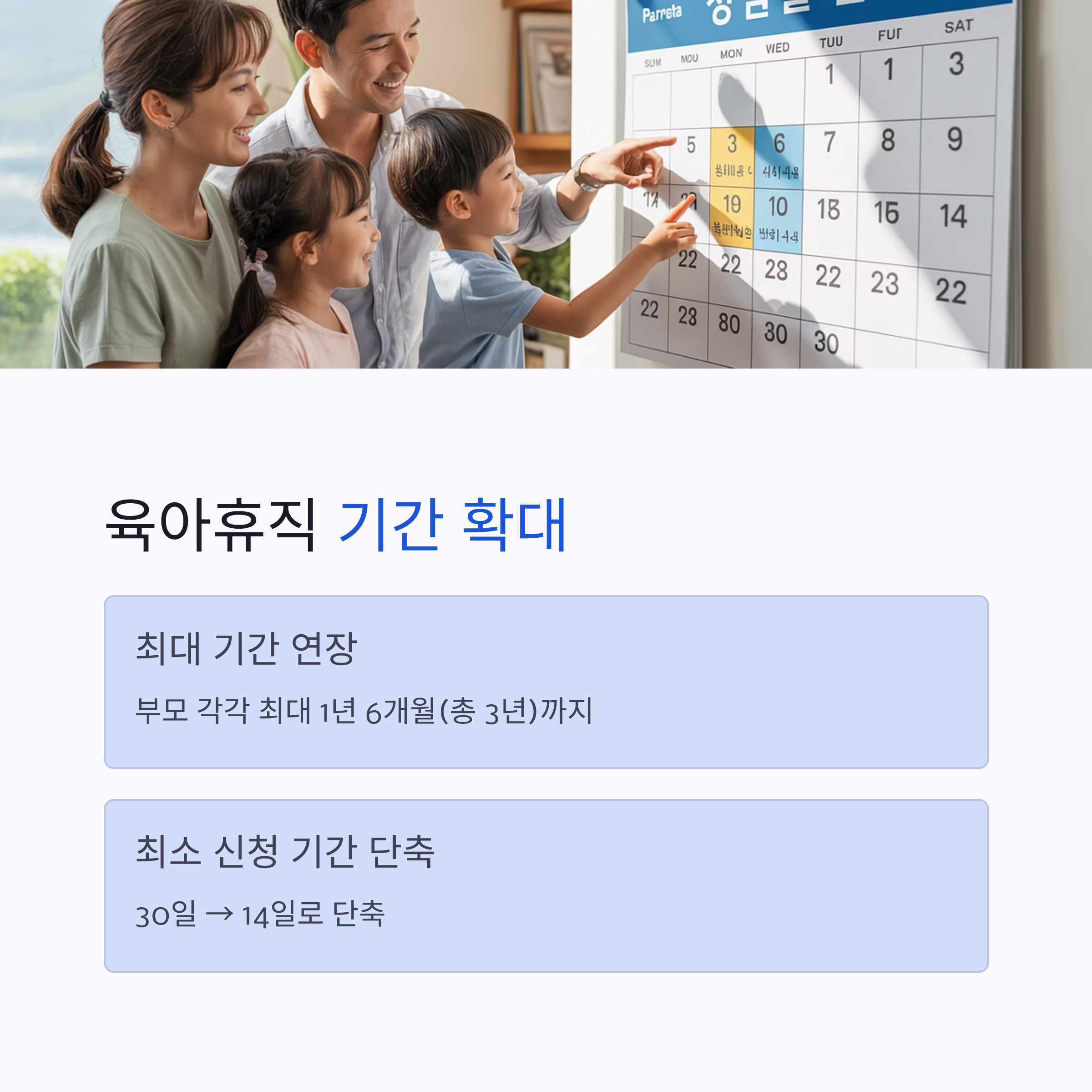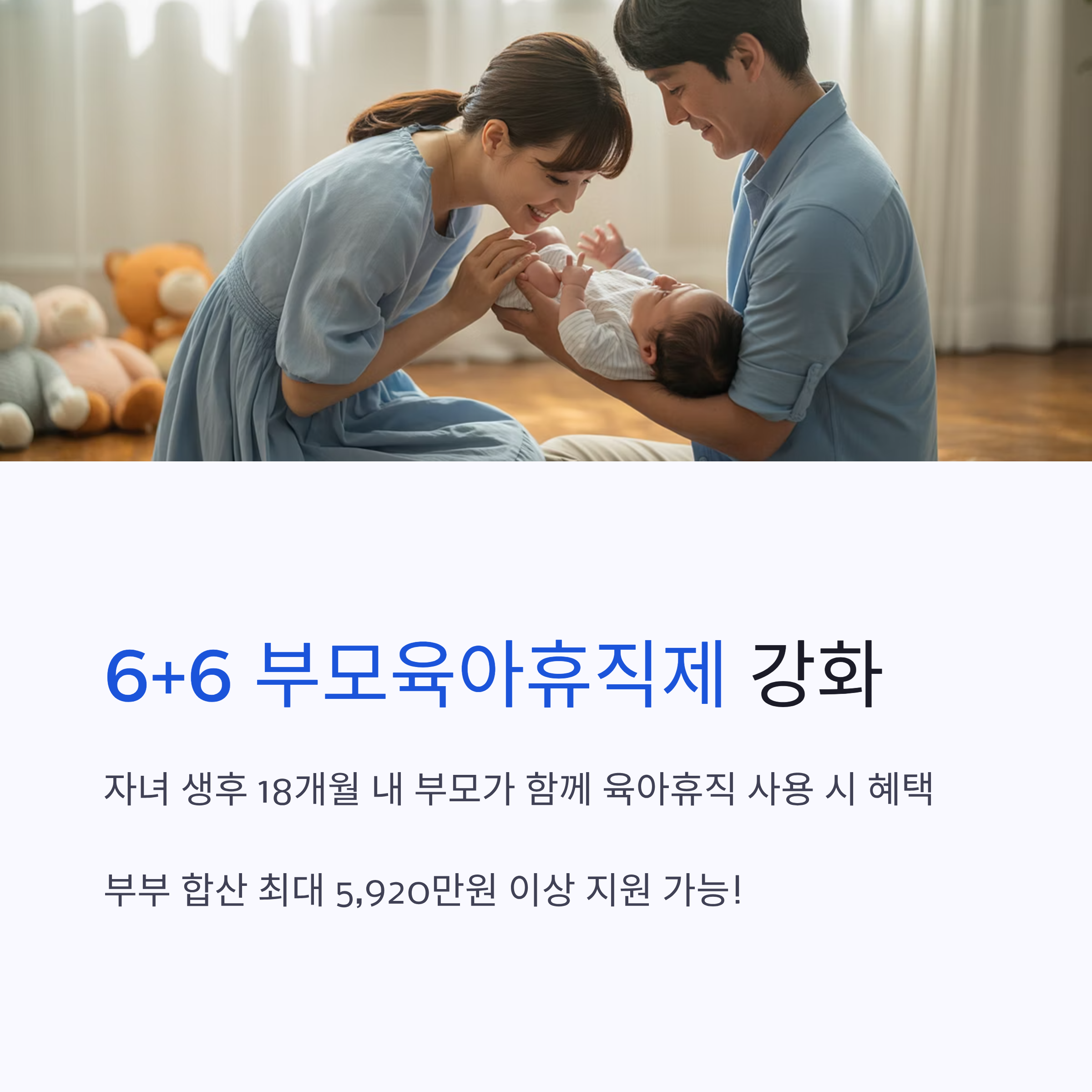 ✅ 육아휴직 기간 연장: 부모 각각 최대 1년 6개월(총 3년)까지 사용 가능해져, 더욱 길게 아이와 함께할 수 있게 됩니다.