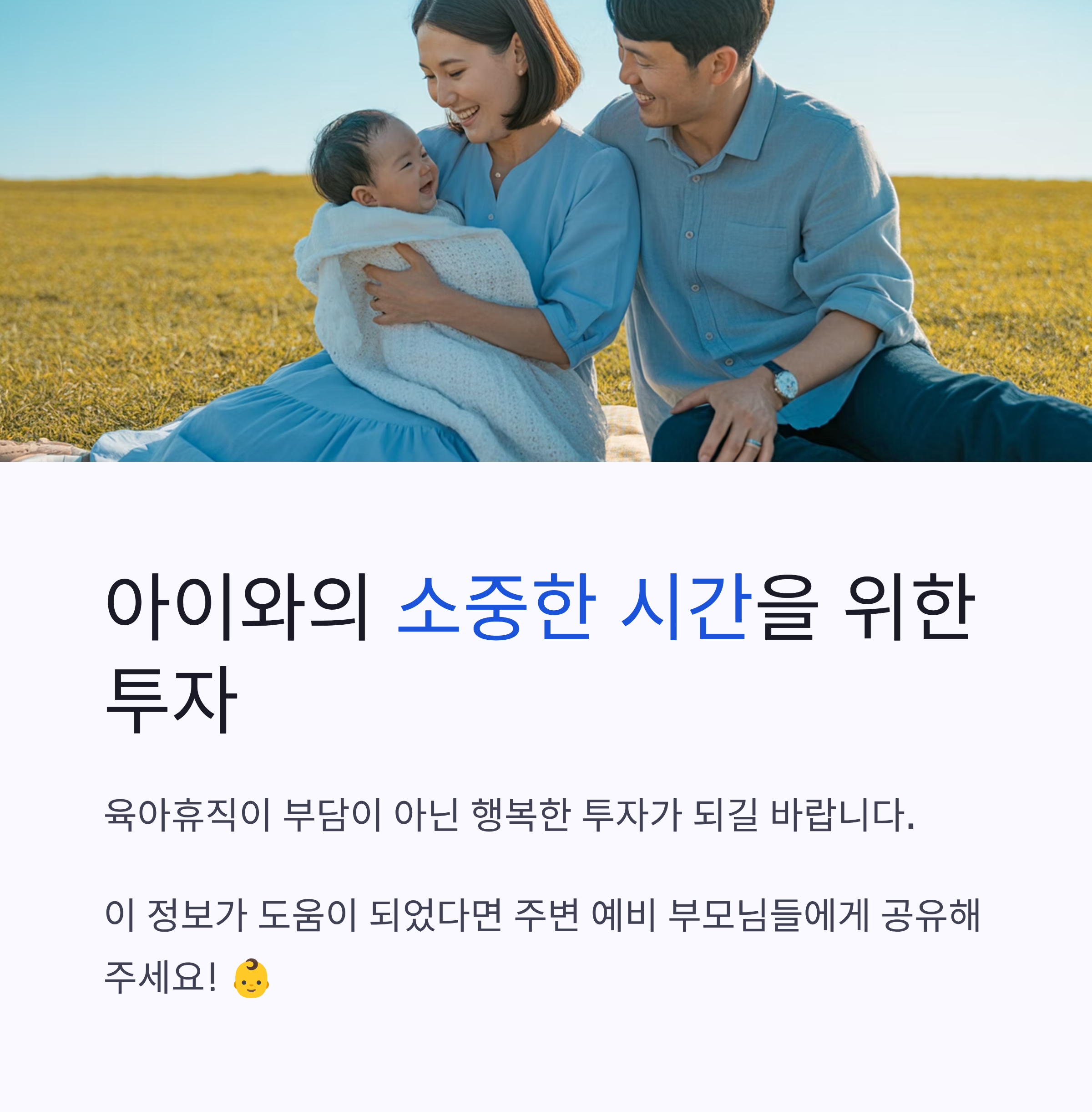 이번 제도 개선을 통해 더 많은 부모님들이 육아휴직을 통해 아이와의 소중한 시간을 보낼 수 있기를 바랍니다. 육아휴직이 부담이 아닌 행복한 투자가 되길 바랍니다. 궁금한 점이 있다면 언제든지 고용센터에 문의하시고, 변화된 혜택을 꼭 누리시길 바랍니다!