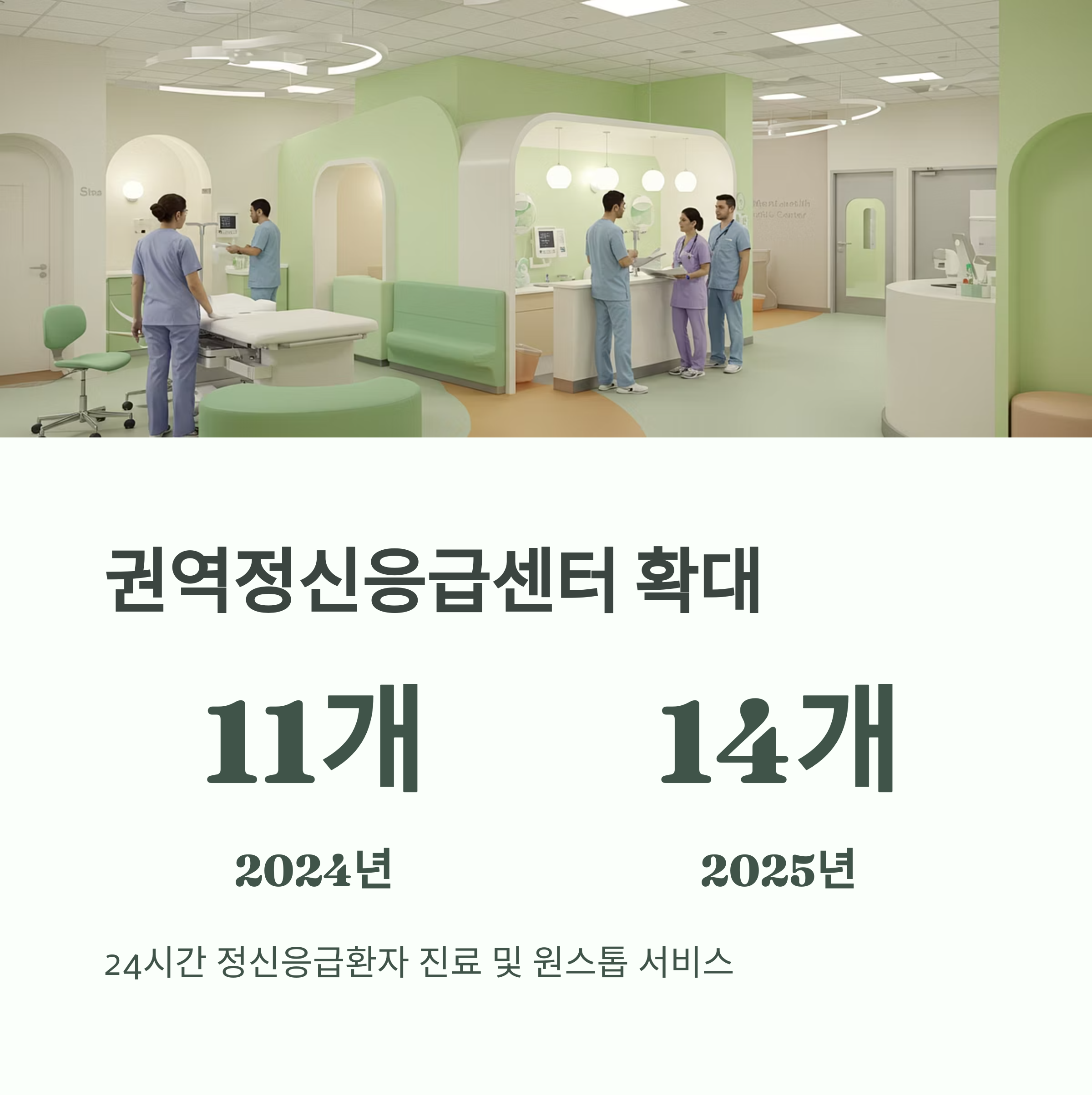- 권역정신응급센터 확대: 2025년 14개소로 늘어나 정신건강 위기환자에게 24시간 신속한 응급진료와 원스톱 서비스를 제공합니다.