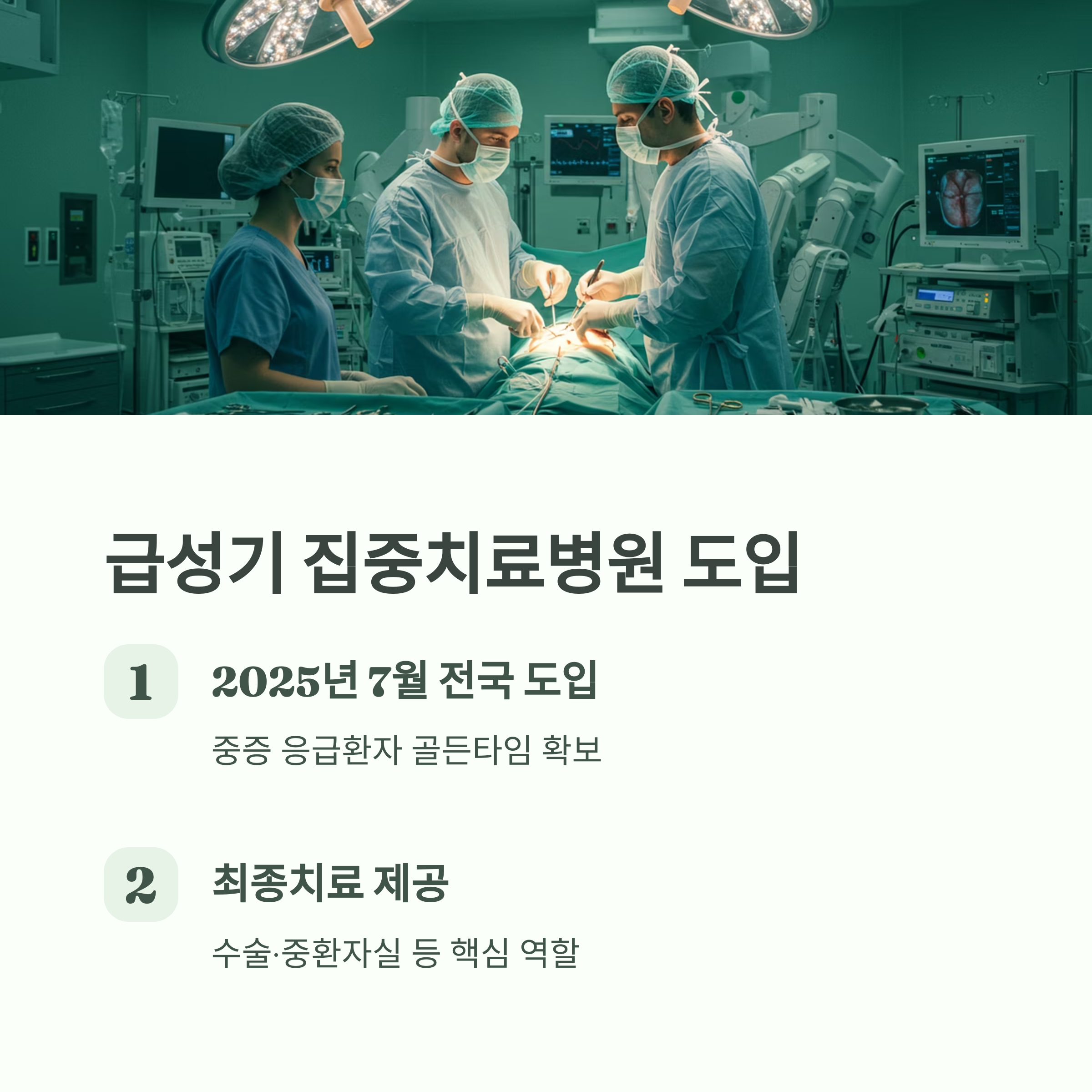 - 급성기 집중치료병원: 중증 환자의 골든타임을 확보하고 사망률을 낮추는 데 핵심적인 역할을 수행합니다.