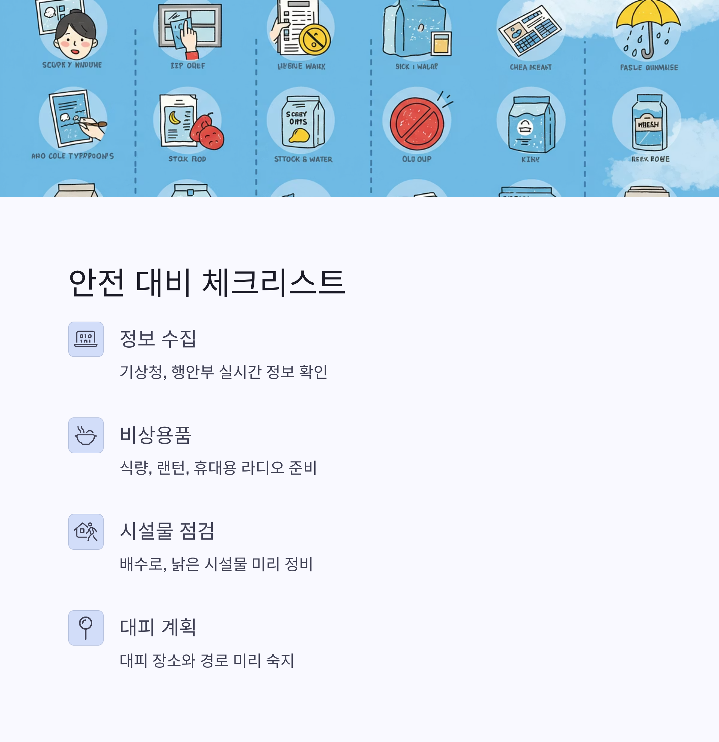 - 시설물 점검: 주택 주변의 배수로를 점검하고, 낡은 시설물이나 간판 등은 미리 고정하거나 철거해야 해요.