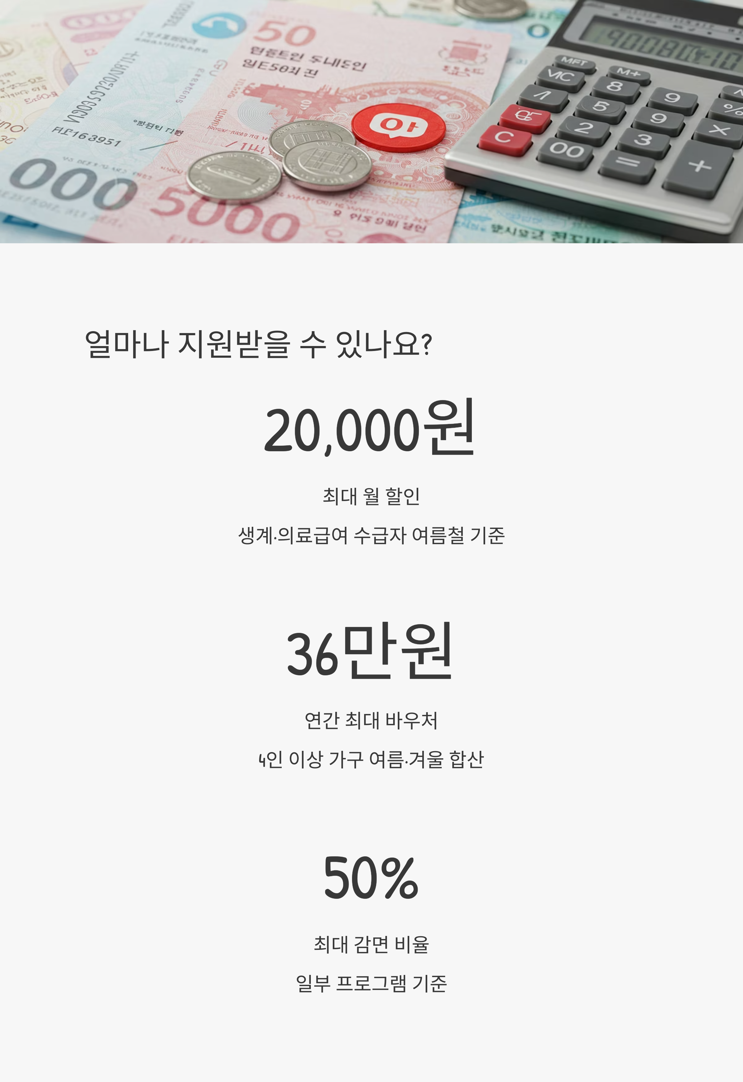 - 생계·의료급여 수급자: 월 최대 16,000원 할인 (여름철에는 월 최대 20,000원까지 확대)