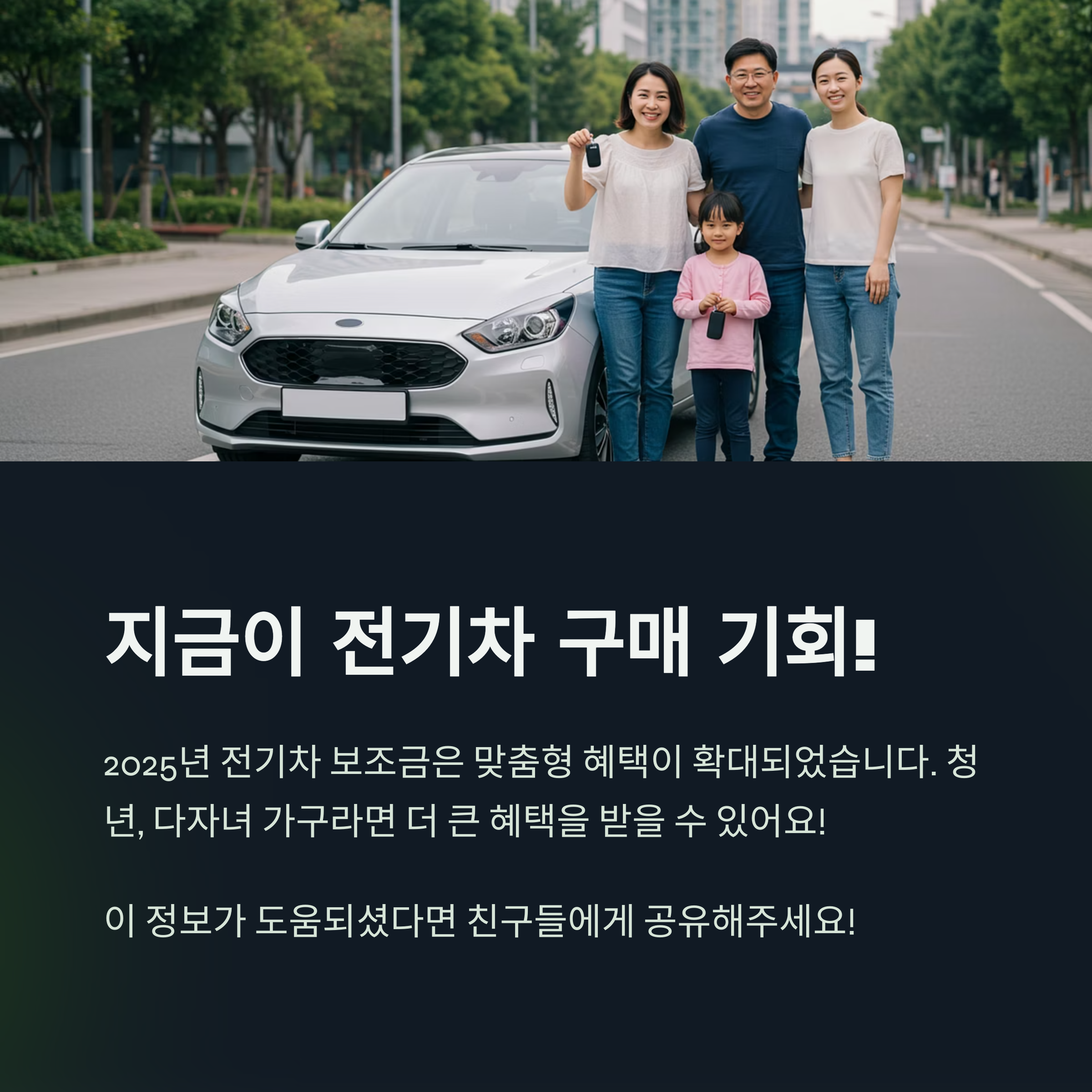 지금까지 2025년 전기차 보조금 정책의 최신 변화와 조건별 지원 내용을 자세히 살펴봤습니다. 최대 지원액은 소폭 감소했지만, 차량 가격 기준 하향, 성능·안전성 평가 강화, 그리고 무엇보다 구매자 맞춤 인센티브와 제조사 할인 연계 보조금이 확대된 것이 이번 정책의 가장 큰 특징이라고 할 수 있습니다. 특히 청년, 다자녀 가구, 저소득층에게는 실질적인 구매 혜택이 더욱 커졌으니, 본인이 해당되는지 꼼꼼히 확인해 보세요.