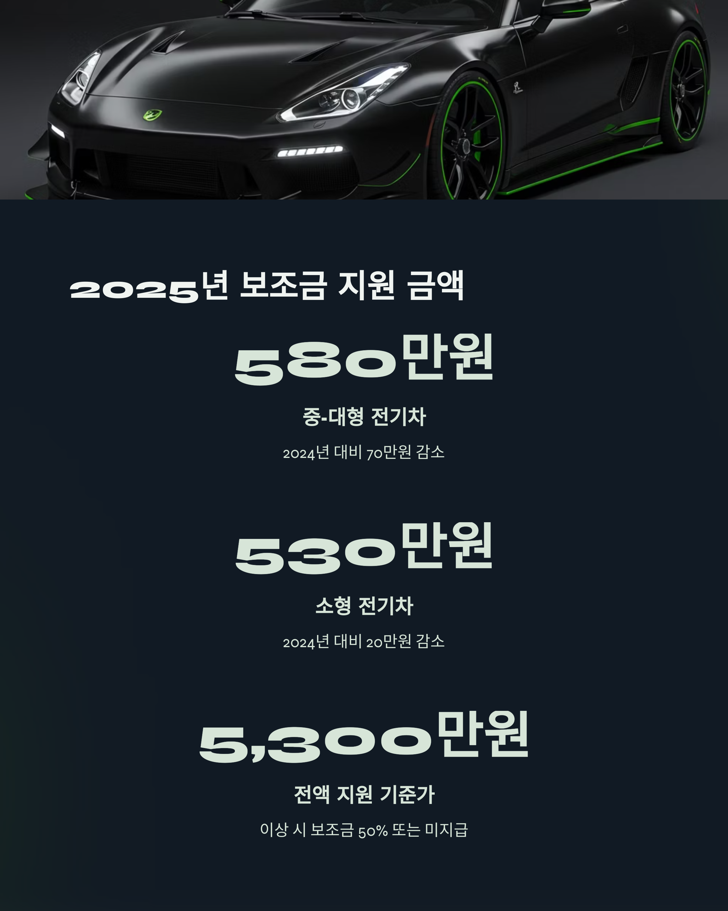 - 중·대형 전기차: 최대 580만 원 (2024년 대비 70만 원 감소)