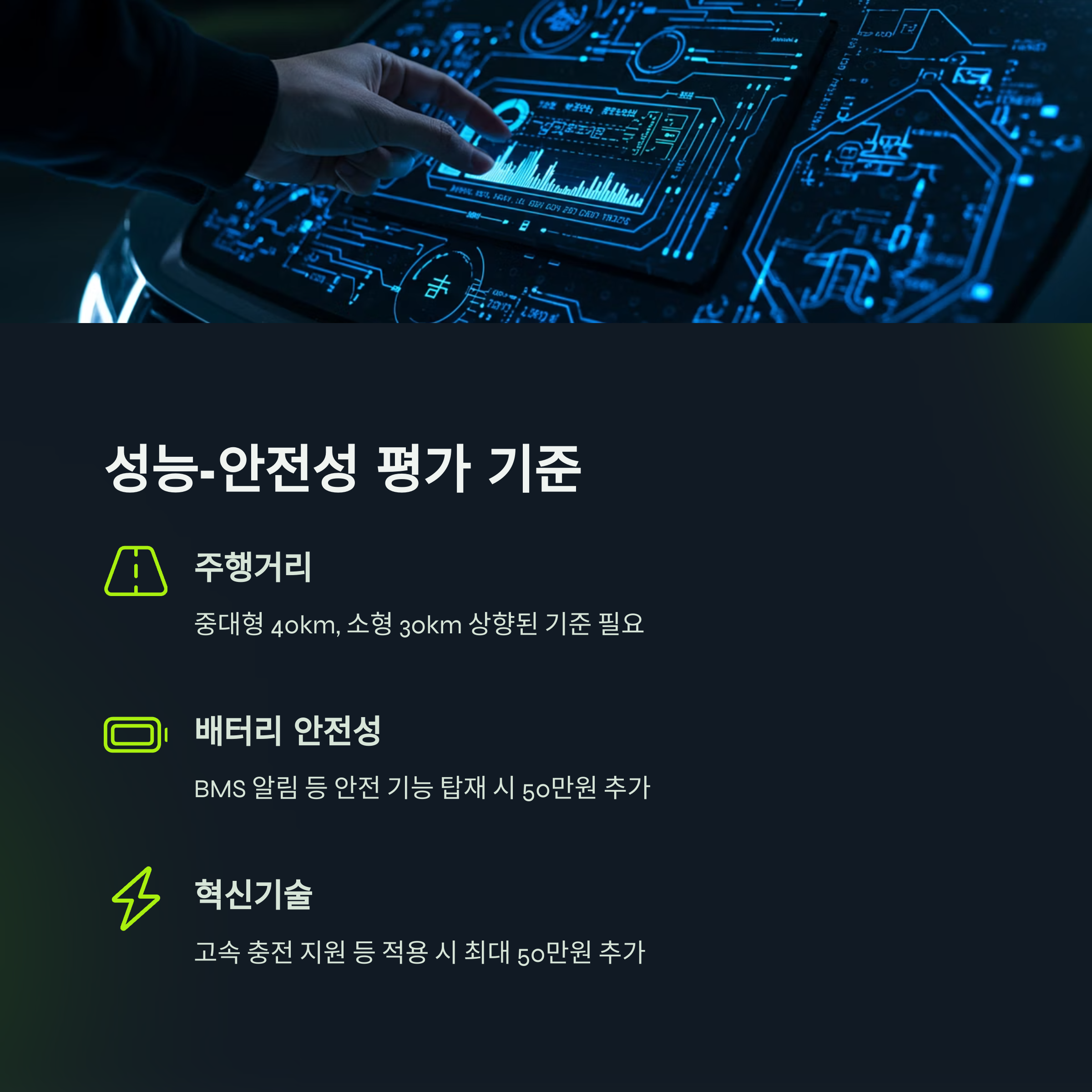 이제 보조금은 단순히 '전기차'라는 이유만으로 받을 수 있는 게 아니에요. 차량의 주행거리, 배터리 안전성, 그리고 얼마나 혁신적인 기술이 적용되었는지에 따라 보조금이 달라집니다.