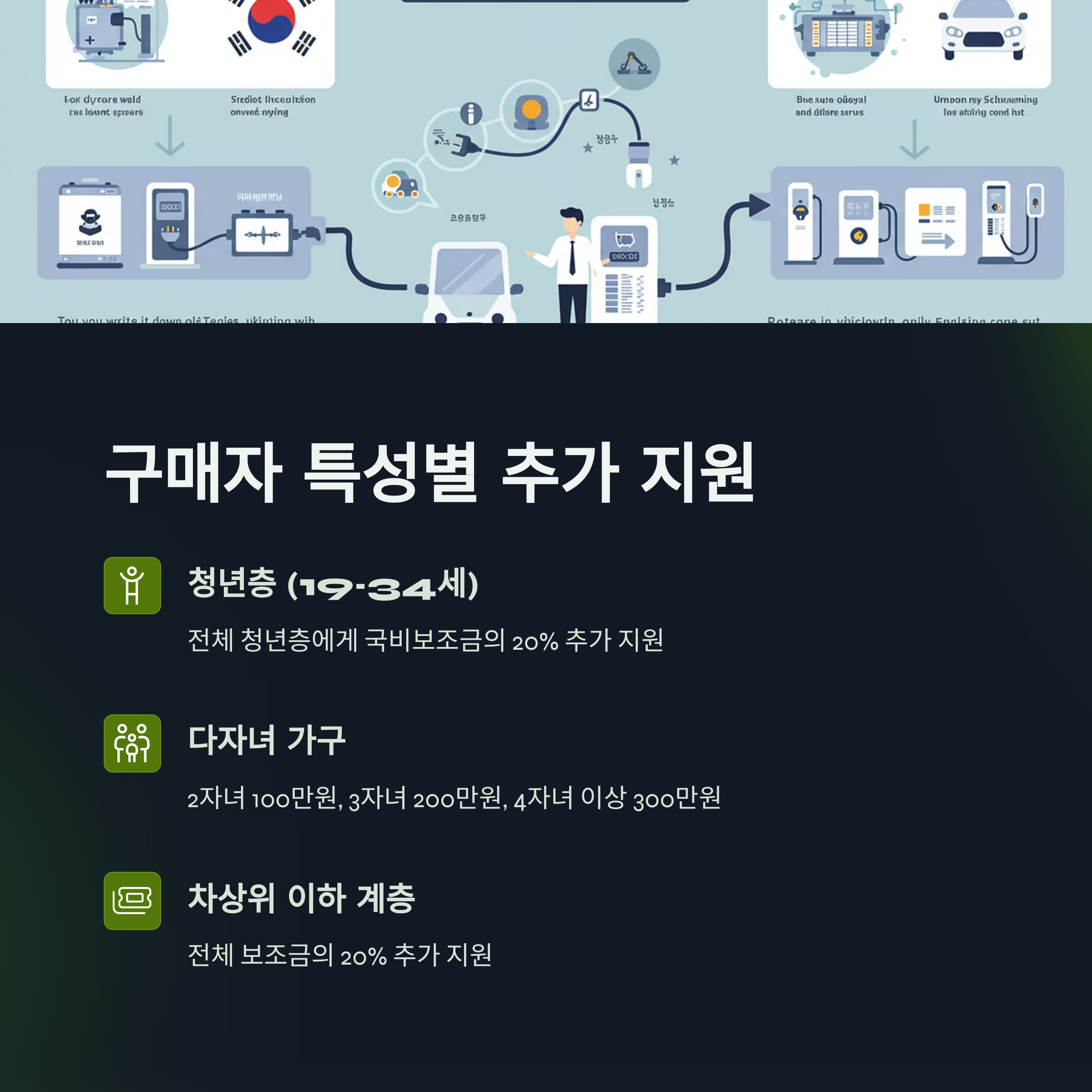 - 청년 (생애 첫차, 19~34세): 기존에는 차상위 이하 계층 청년에게만 최대 30% 추가 지원되던 것이, 2025년부터는 전체 청년층에게 국비보조금의 20%를 추가 지원합니다. 정말 좋은 기회죠!