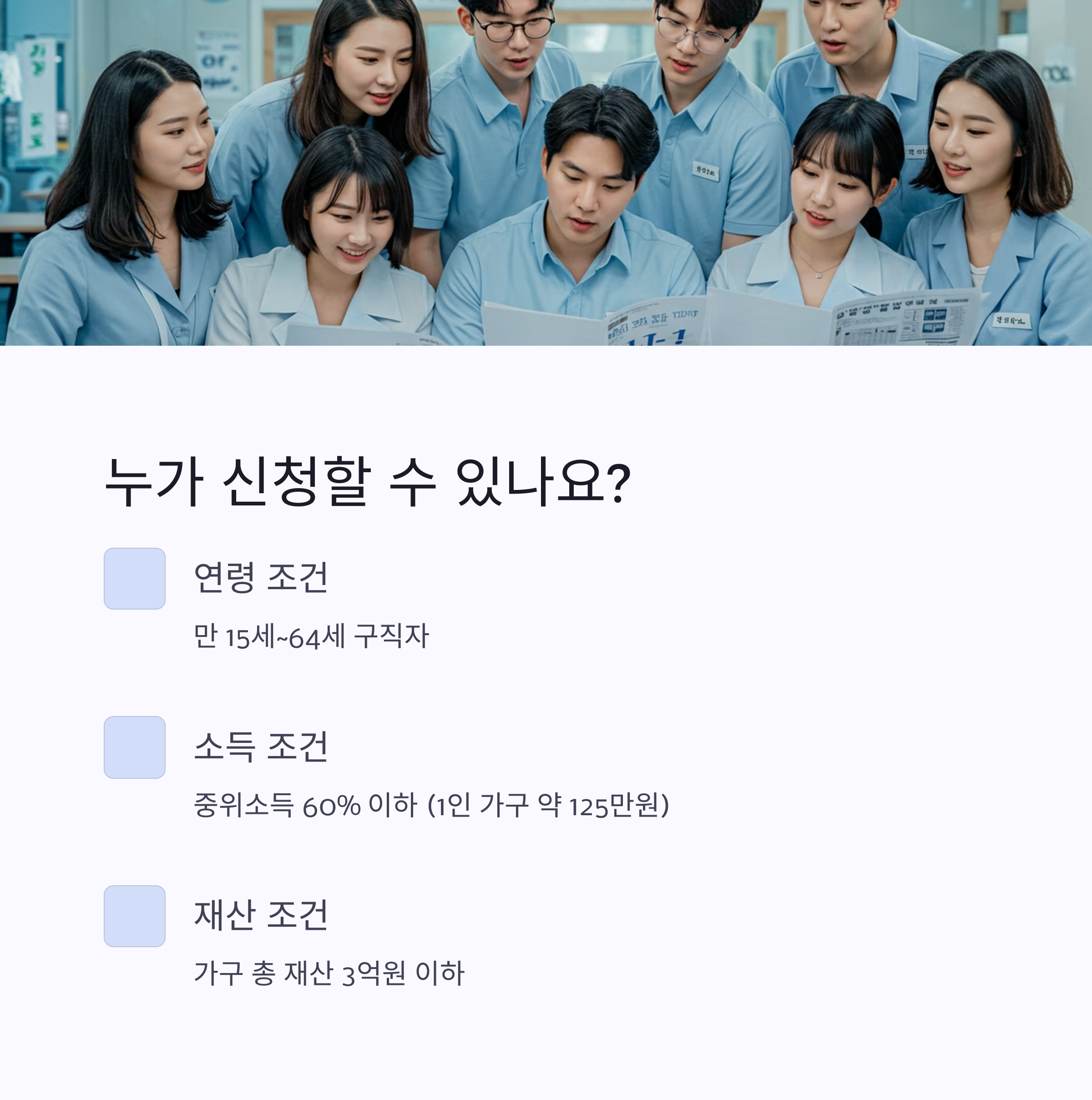 - 재산 요건: 가구 총 재산이 3억 원 이하여야 합니다. 주택, 자동차, 금융자산 모두 포함이에요.