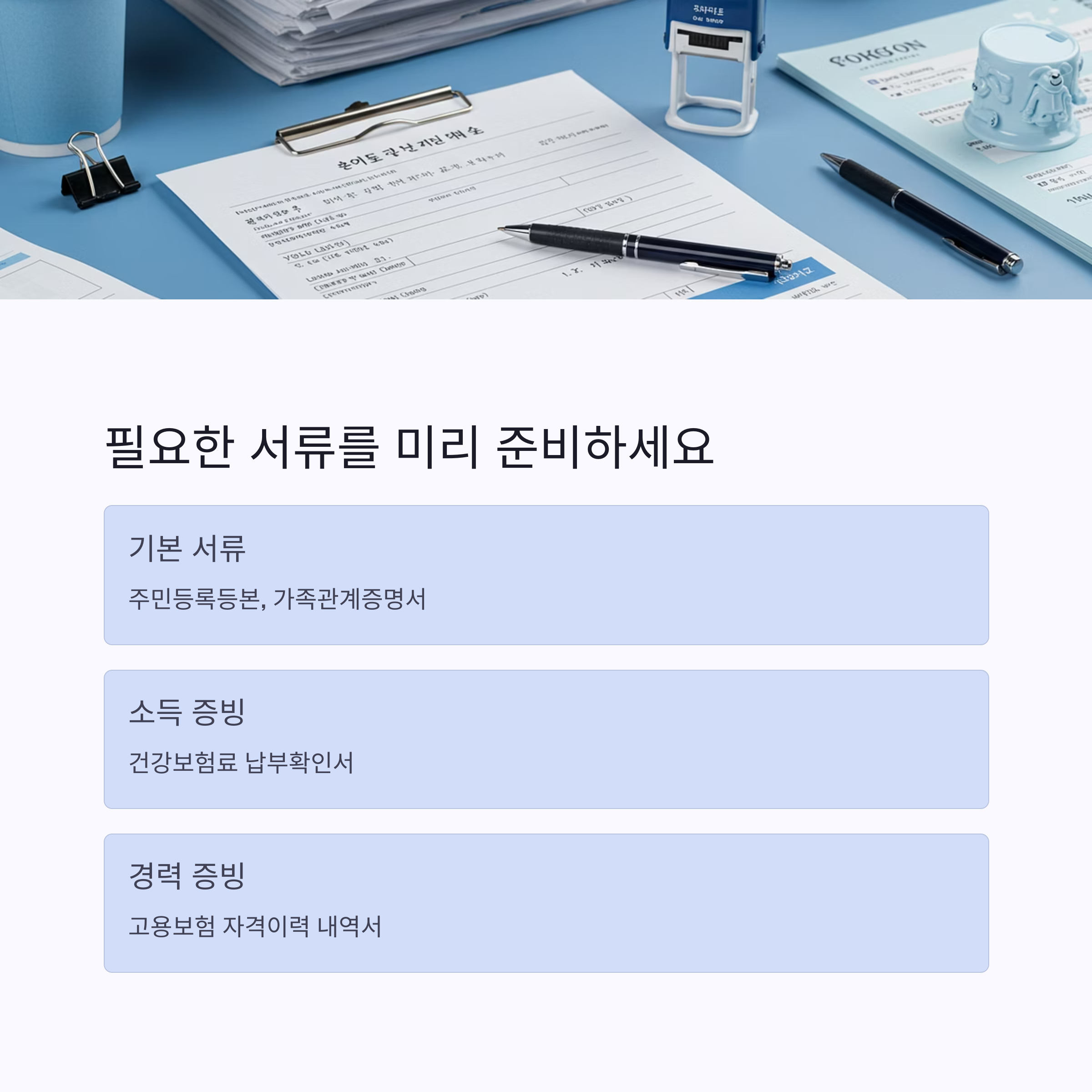 - 건강보험료 납부확인서: 소득 요건 확인에 중요한 서류 중 하나입니다. 직장가입자는 직장 건강보험료 납부확인서를, 지역가입자는 지역 건강보험료 납부확인서를 준비해주세요.