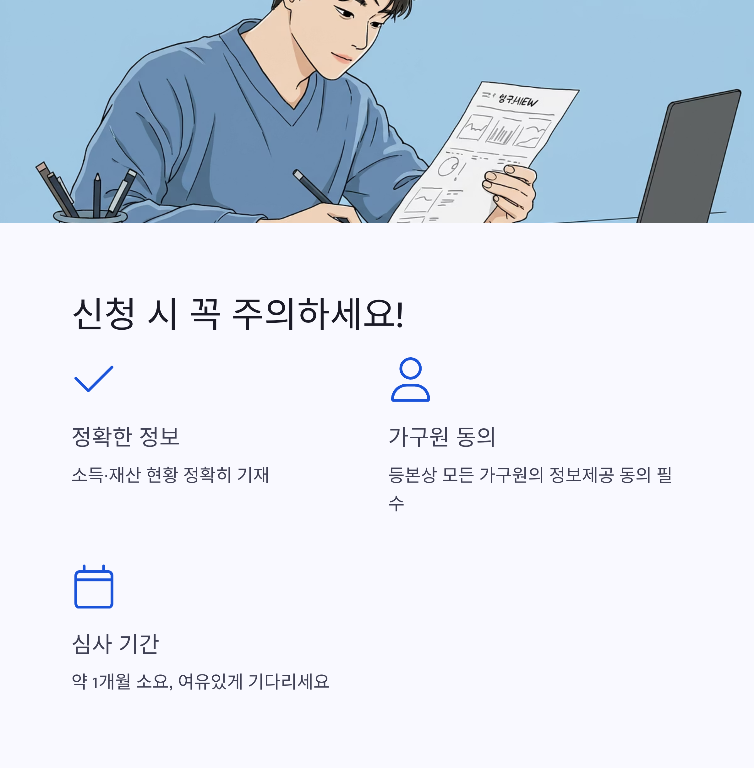 - 소득·재산 현황 정확히 확인: 신청 전에 본인과 가구의 소득, 재산 현황을 반드시 정확하게 확인해야 해요. 기준을 초과하면 지원받을 수 없으니 주의해야겠죠?