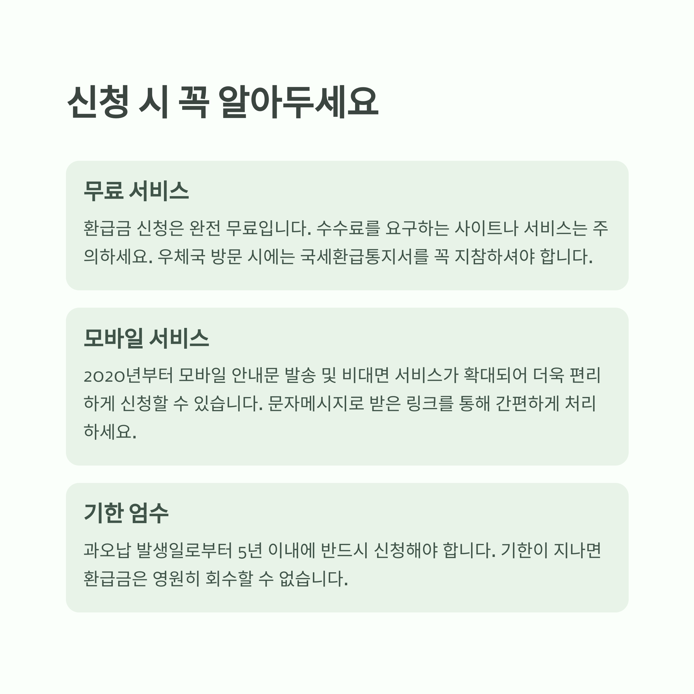 - 소멸시효 주의: 5년 이내 환급 신청 필수 (특히 종합소득세 신고 기간 전후로 확인)