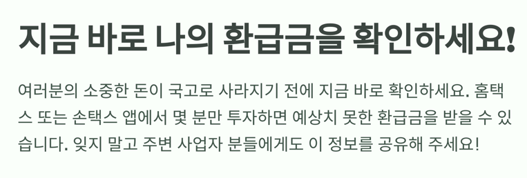 5분만 투자하면 잊고 있던 사업자금을 되찾을 수 있습니다. 경기 불황 시기, 이미 납부한 세금 중 돌려받을 수 있는 금액을 확인해 보세요.
