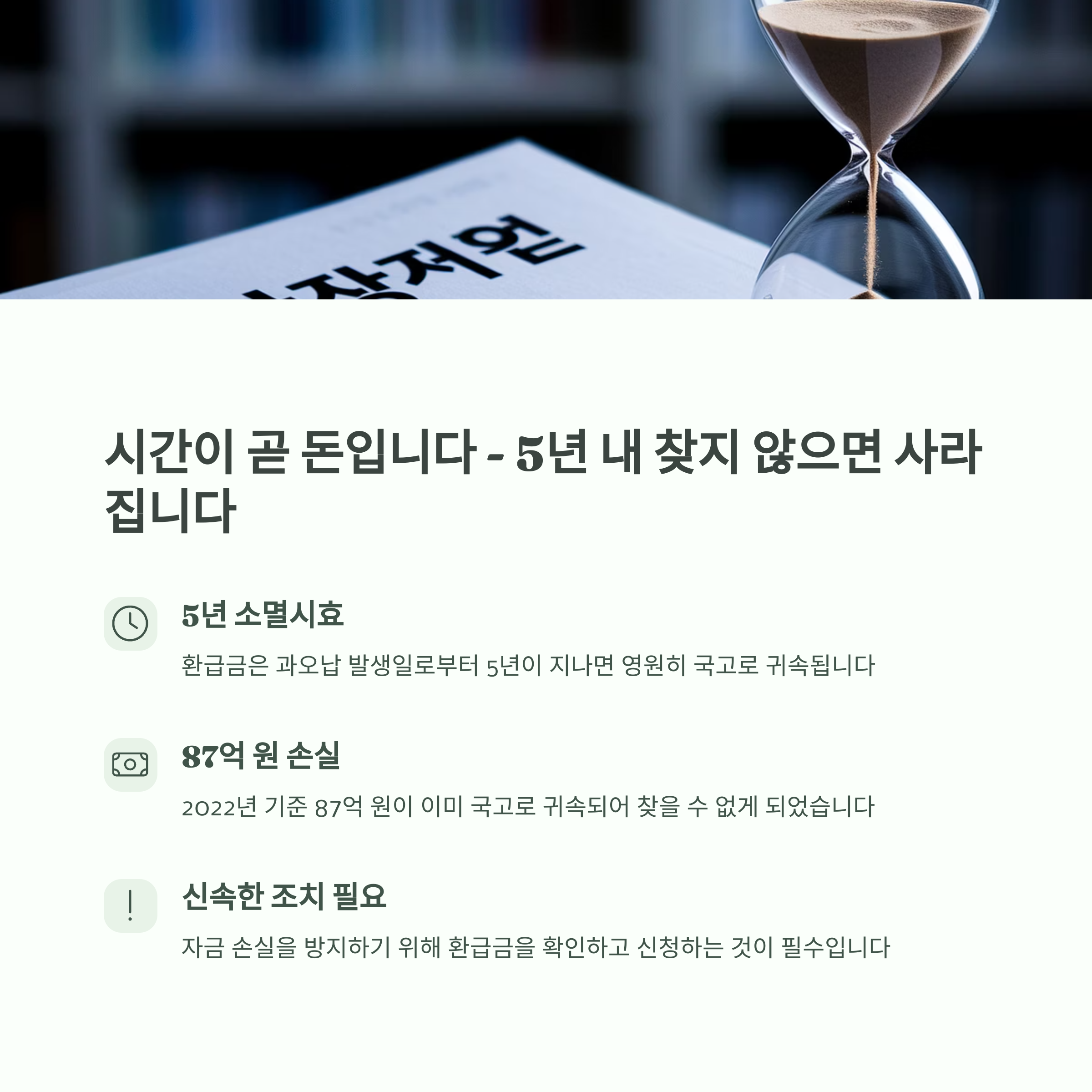 - 소멸시효 주의: 5년 이내 환급 신청 필수 (특히 종합소득세 신고 기간 전후로 확인)
