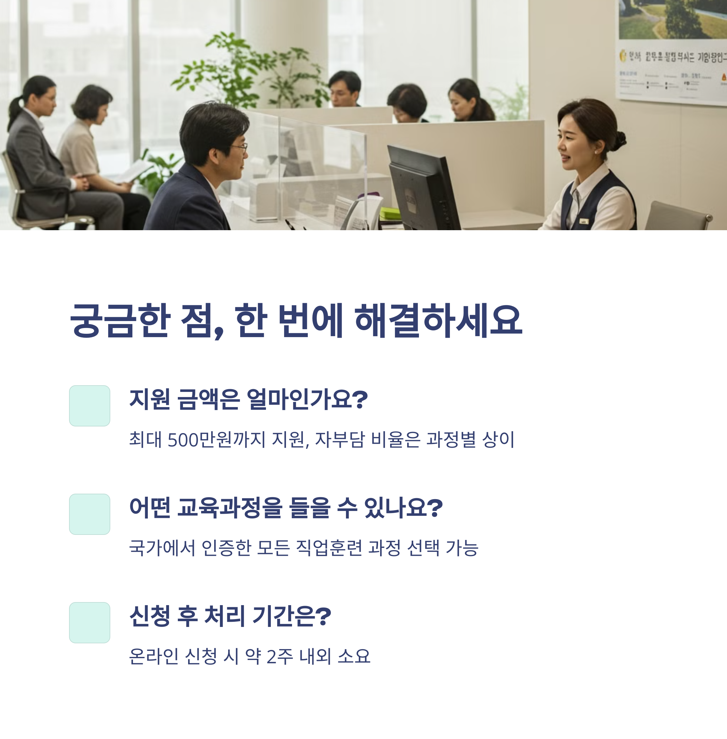 이철수님(29세)은 일반 사무직으로 3년간 근무했지만 낮은 연봉과 성장 한계를 느꼈습니다. 국민내일배움카드로 'K-디지털 자바 개발자 양성과정'을 6개월간 수강한 후, 웹 개발자로 전직에 성공해 이전보다 70% 높은 연봉을 받게 되었습니다.