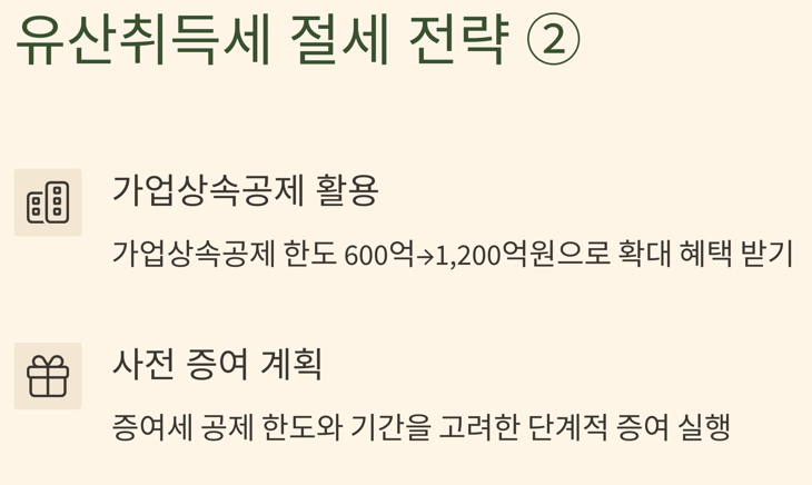 유산취득세 체계에서는 다음과 같은 절세 전략을 고려해볼 수 있습니다: