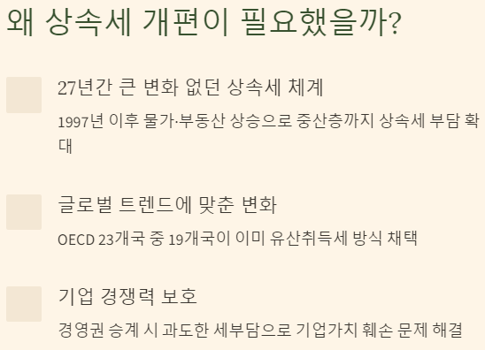 기존 상속세 체계에서는 OECD 국가 중 최고 수준의 세율(최대 50%)로 인해 상속인들의 세금 부담이 컸고, 이로 인해 기업 활동 위축이나 해외 자본 유출과 같은 부작용이 발생했습니다. 이러한 문제점을 해결하기 위해 정부는 상속세 체계를 전면 개편하는 방안을 검토해왔고, 그 결과 '유산취득세' 도입을 핵심으로 하는 2025 상속세 개정안이 마련되었습니다.