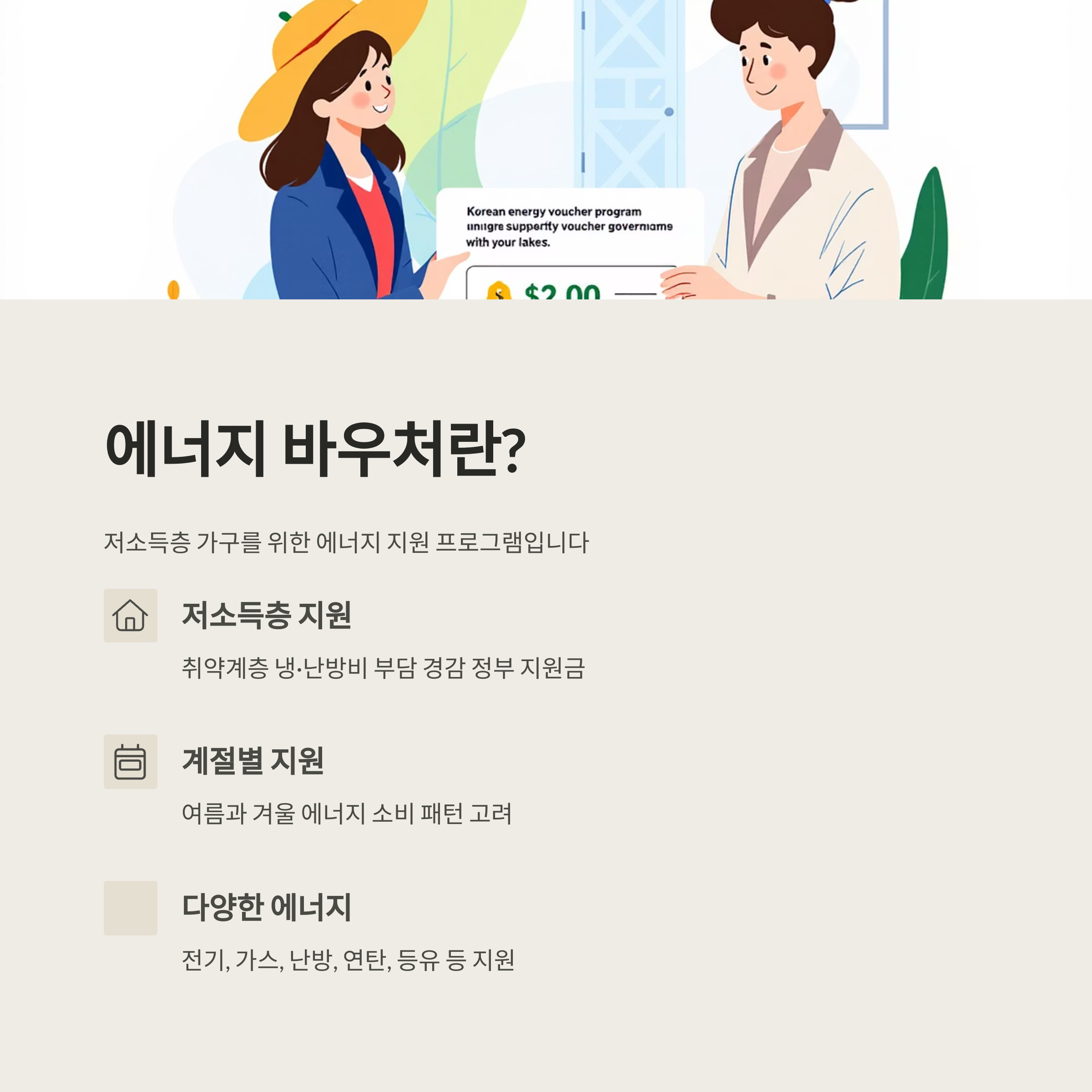 • 기초생활수급자와 차상위계층 등 에너지 취약계층에게 전기, 도시가스, 지역난방, 연탄, 등유, LPG 등 다양한 에너지 비용을 지원하는 복지 제도로, 계절적 에너지 소비 패턴을 고려해 여름과 겨울로 나누어 지원합니다.