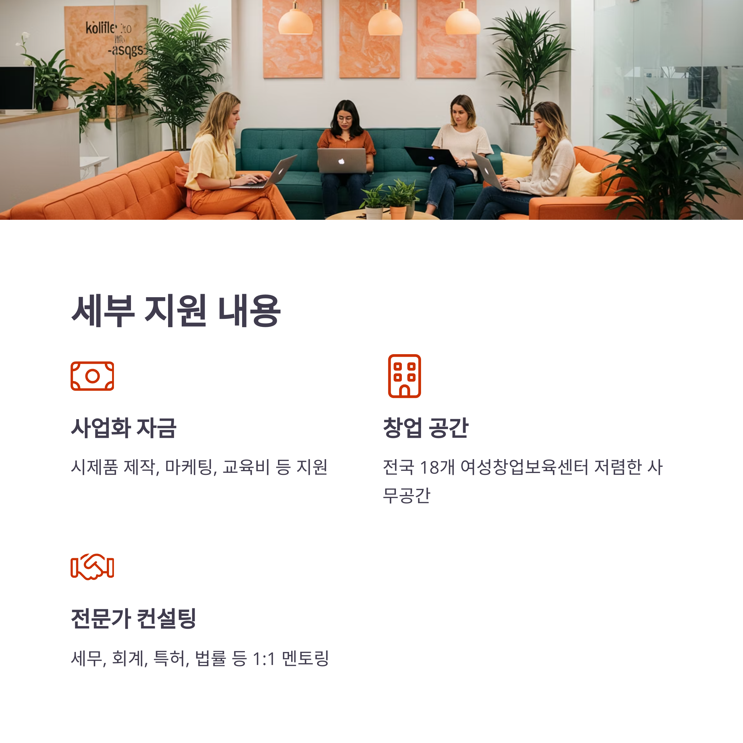 | 비금전적 지원 | 창업 공간, 전문가 컨설팅, 맞춤형 교육, 네트워킹 기회, 육아 친화 시설 등 |