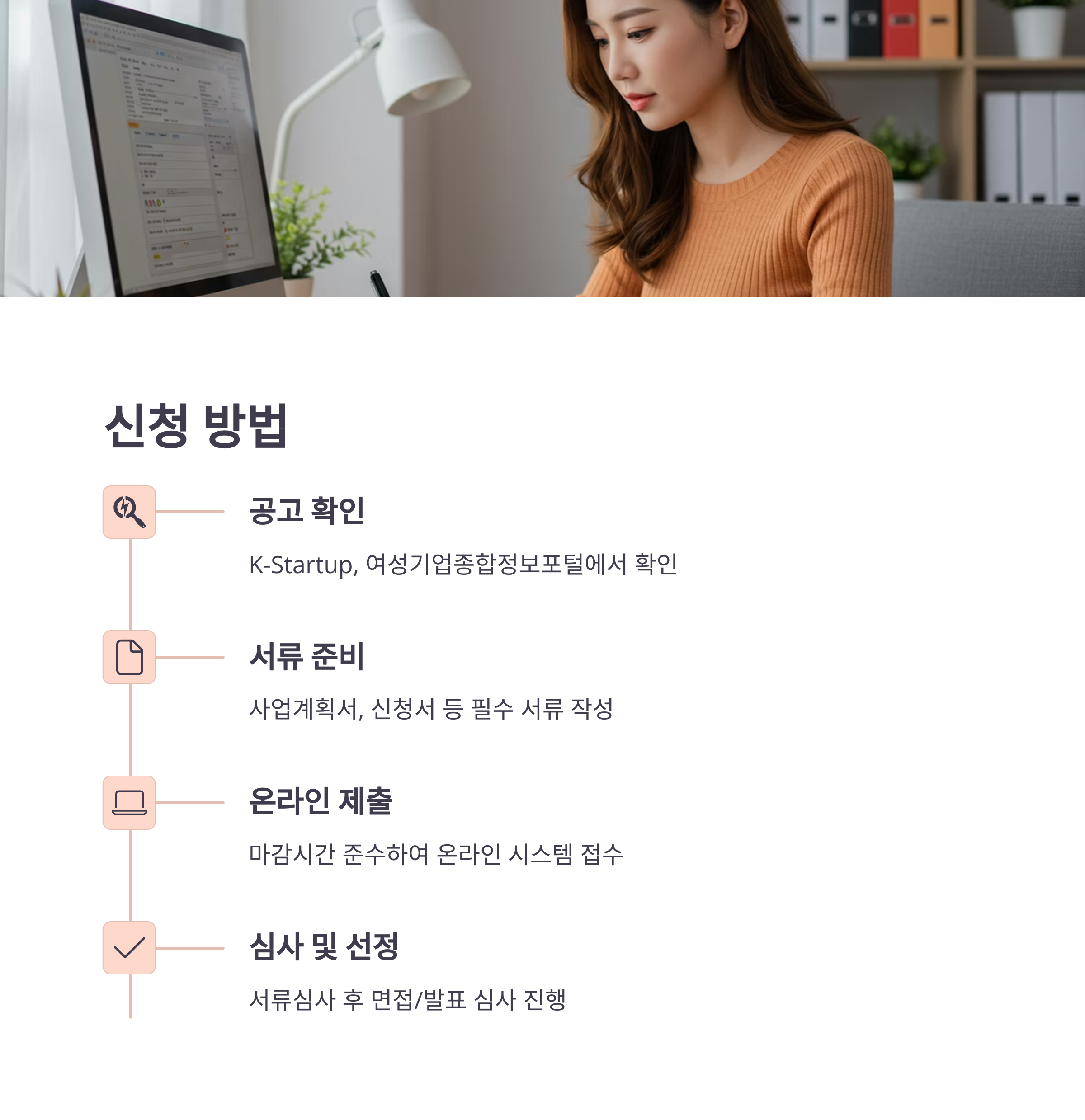 자, 그럼 이렇게 좋은 여성창업 지원사업들은 어떻게 신청해야 할까요? 생각보다 어렵지 않으니 차근차근 따라오세요!