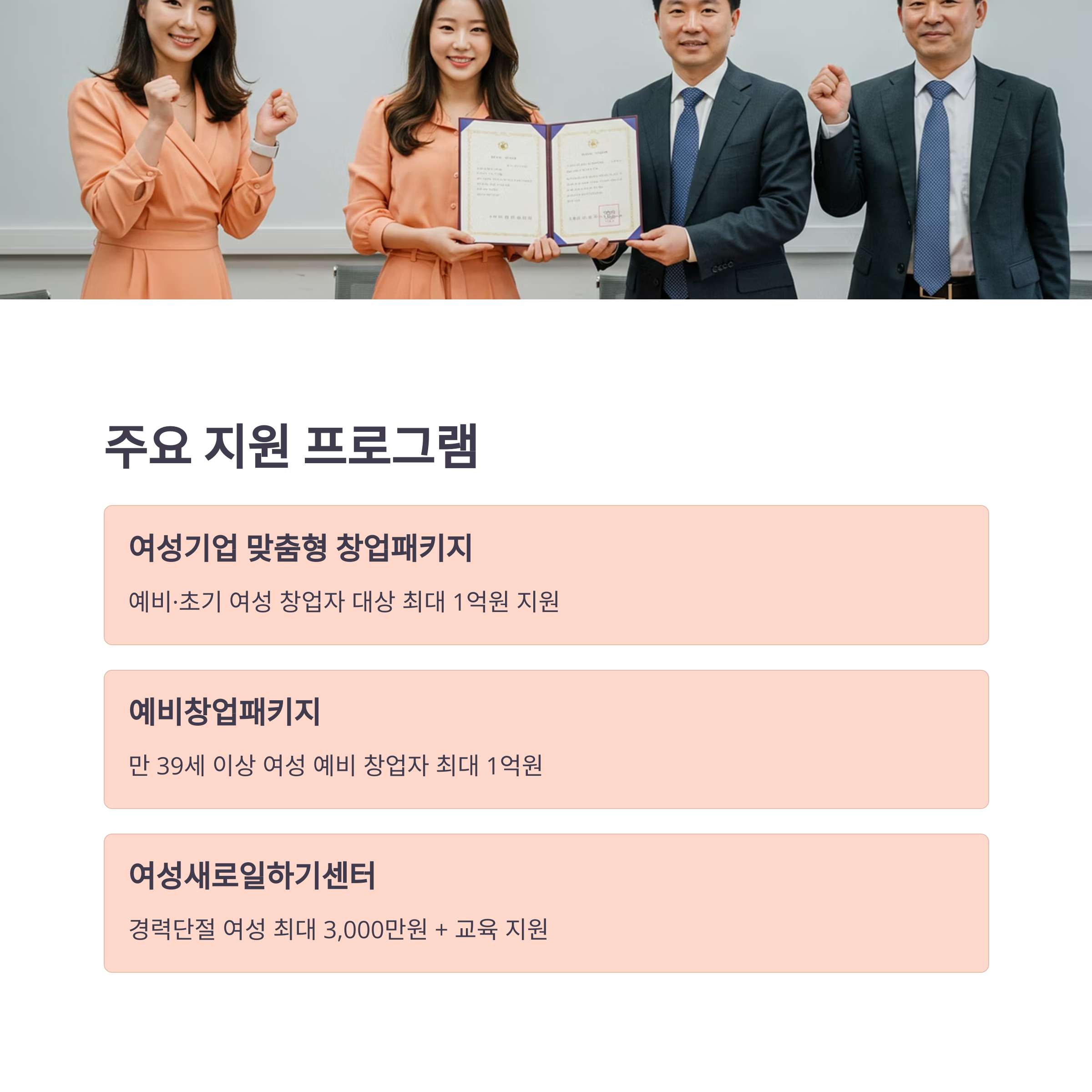 | 여성새로일하기센터 창업지원 | 경력단절 여성 | 최대 3,000만 원 + 교육 | 재취업+창업 연계, 교육 필수 |
