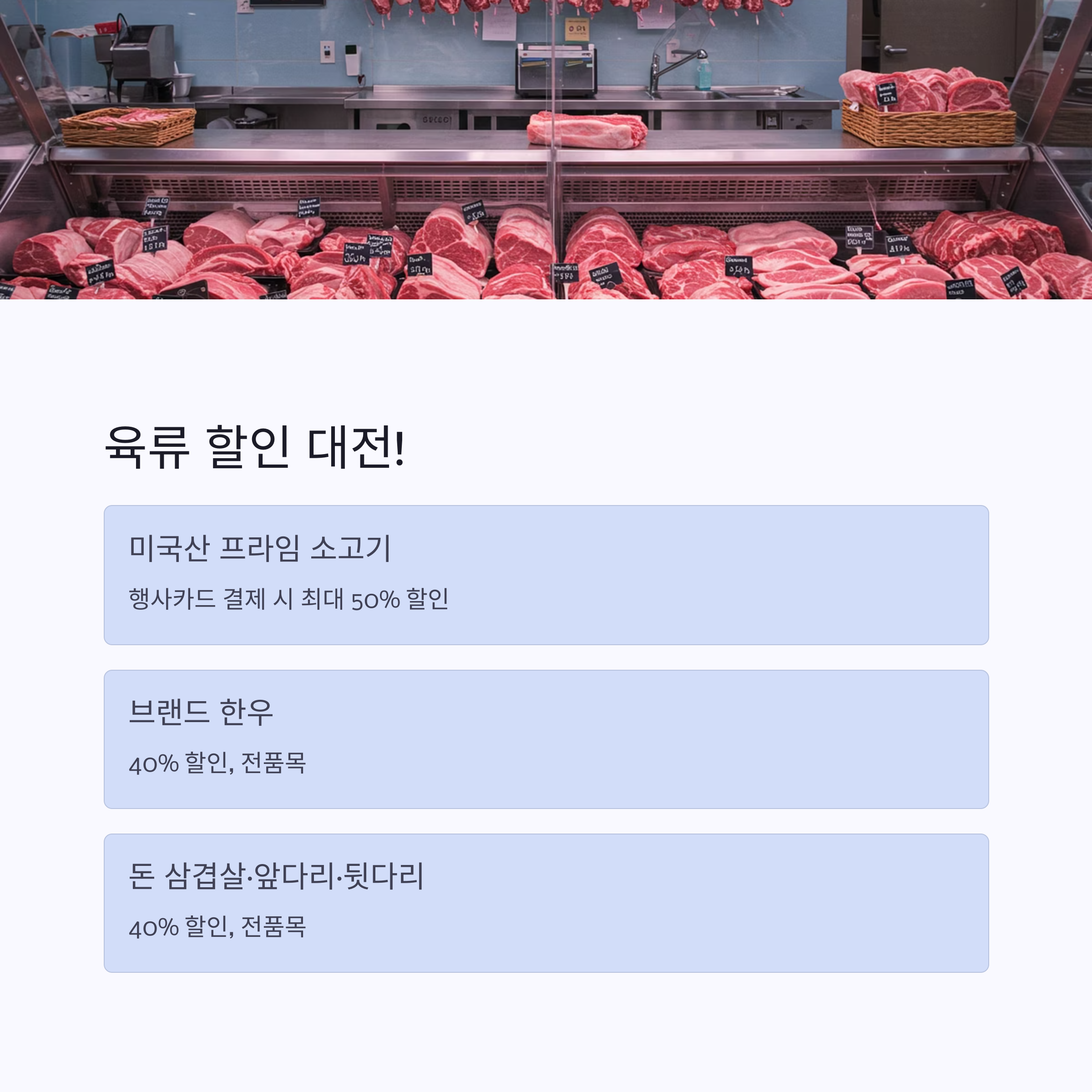 - 미국산 프라임등급 소고기 전품목: 행사카드 결제 시 최대 50% 할인! 이건 진짜 놓치면 안 되는 딜입니다.