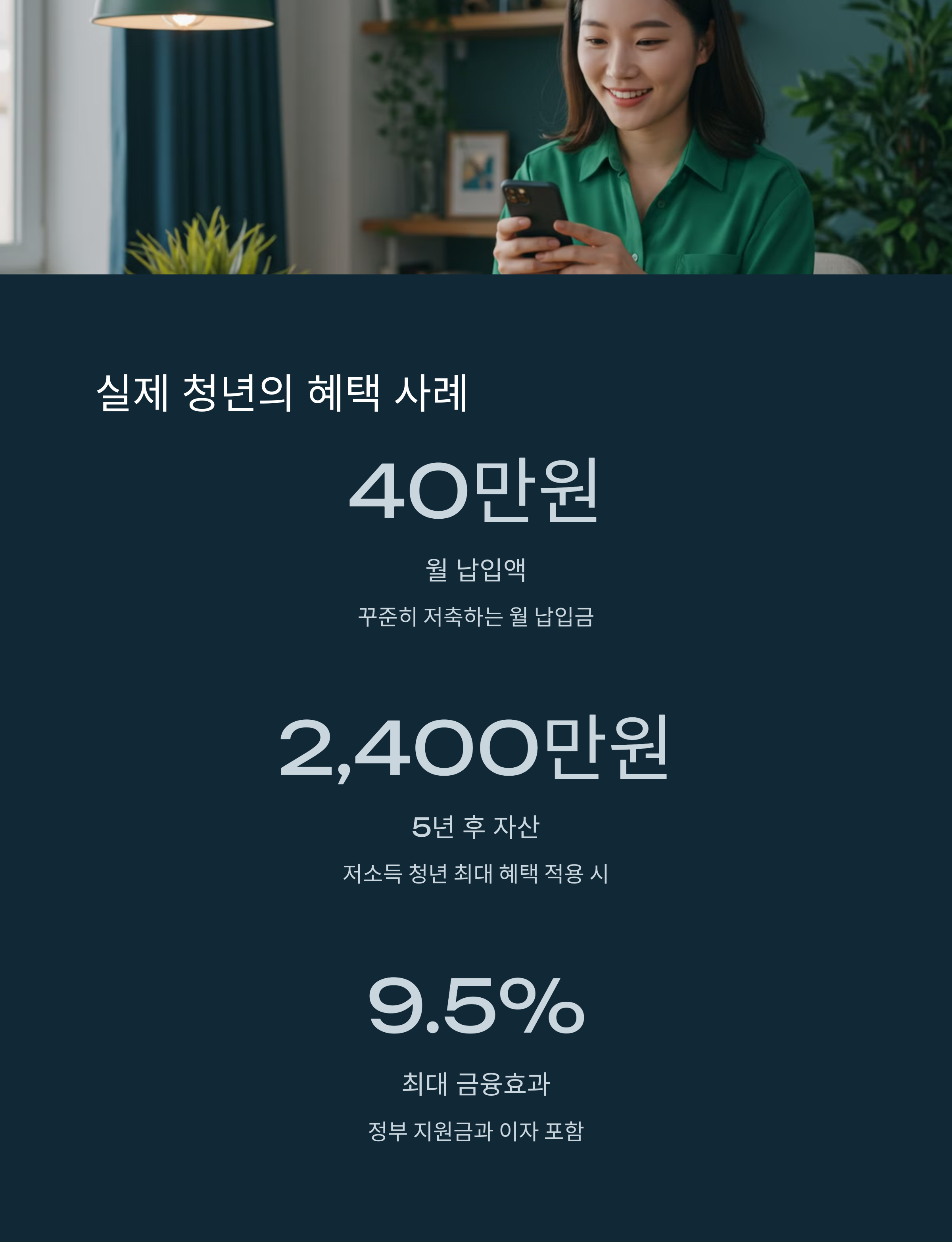 월 최대 70만 원 납입 시, 정부가 최대 2만~4만 원을 추가로 지원하고 5년 후에는 5천만 원까지 자산 형성이 가능하도록 설계된 제도입니다.
