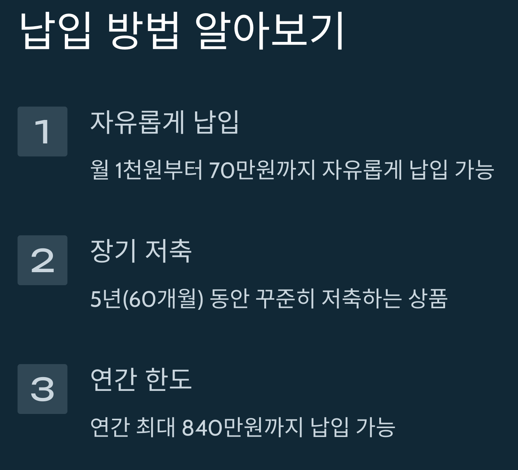 - 자격 확인 → 금융기관 선택 → 계좌 개설 → 매월 납입