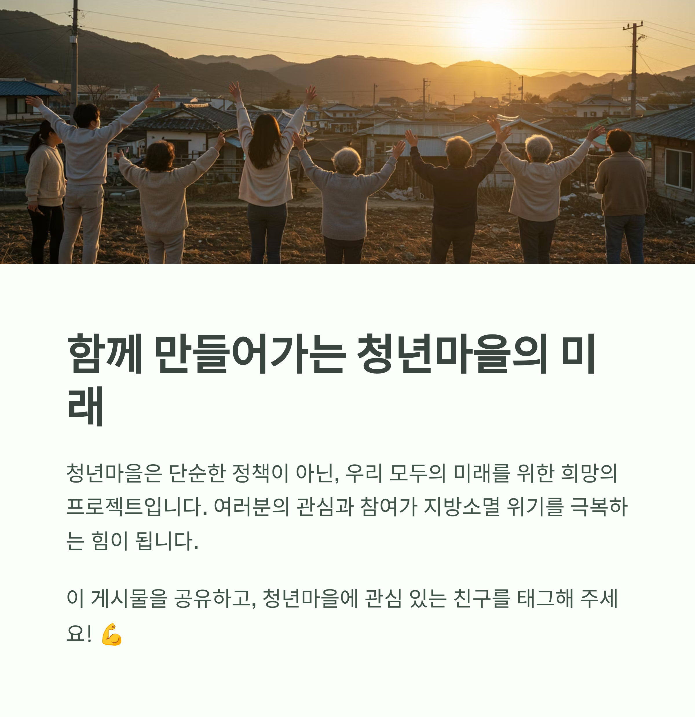- 공동체 강화: 청년 주도의 커뮤니티가 형성되고 지역 문제를 함께 해결해나가면서 지역 공동체 의식이 더욱 튼튼해질 거예요.