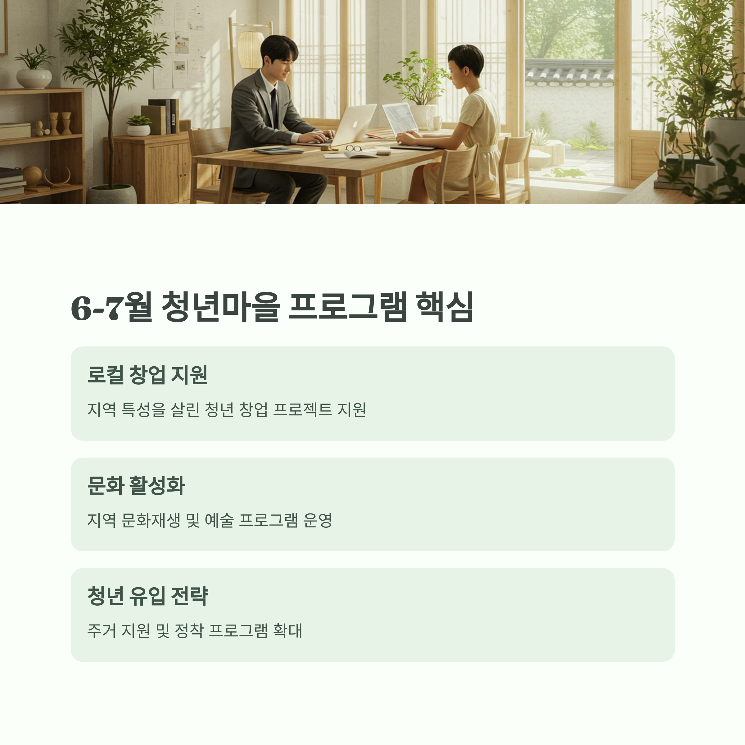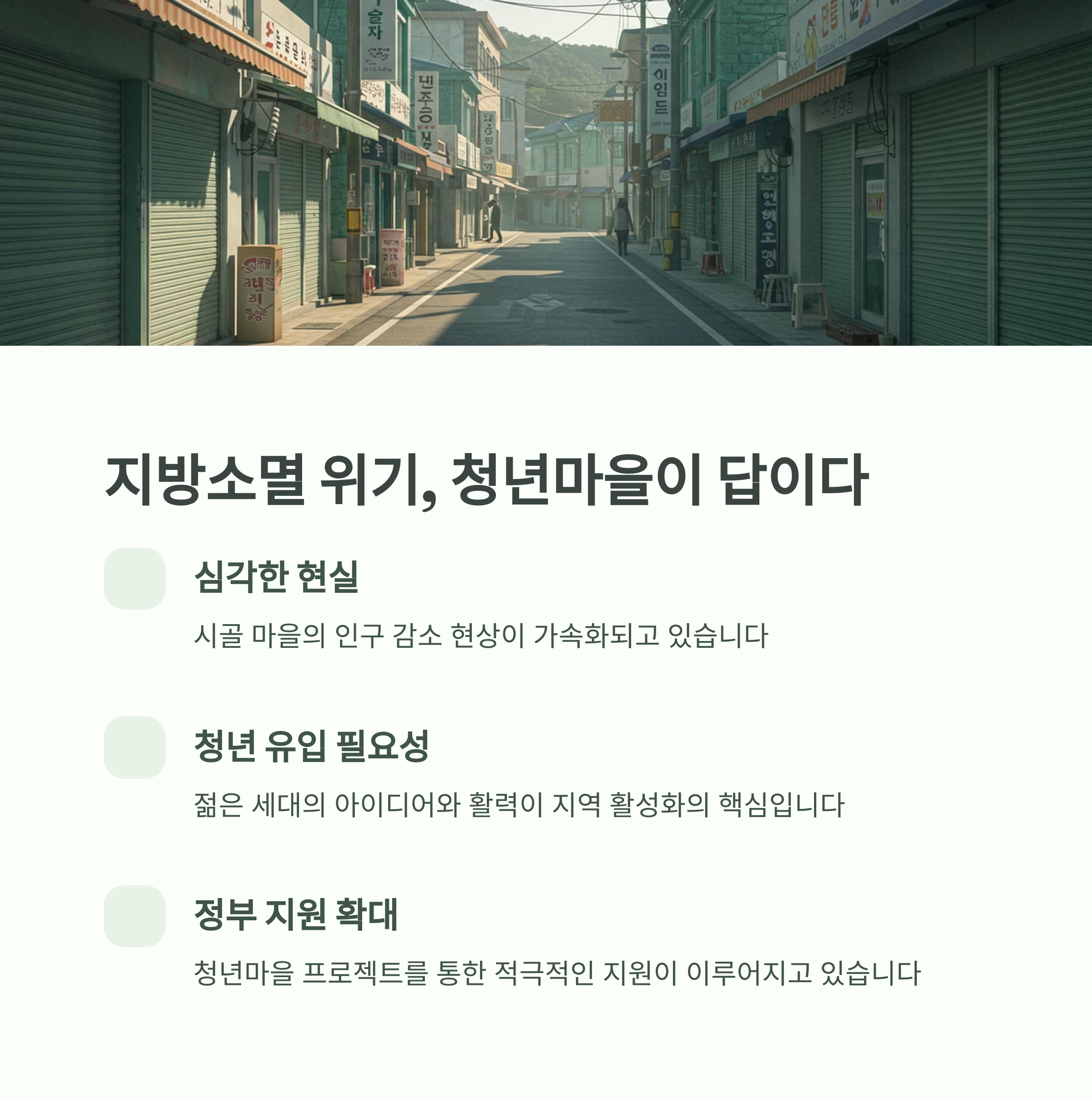 - 주요 기대 효과: 청년 정착률 증가, 지역 경제 활성화, 공동체 강화, 지방소멸 대응