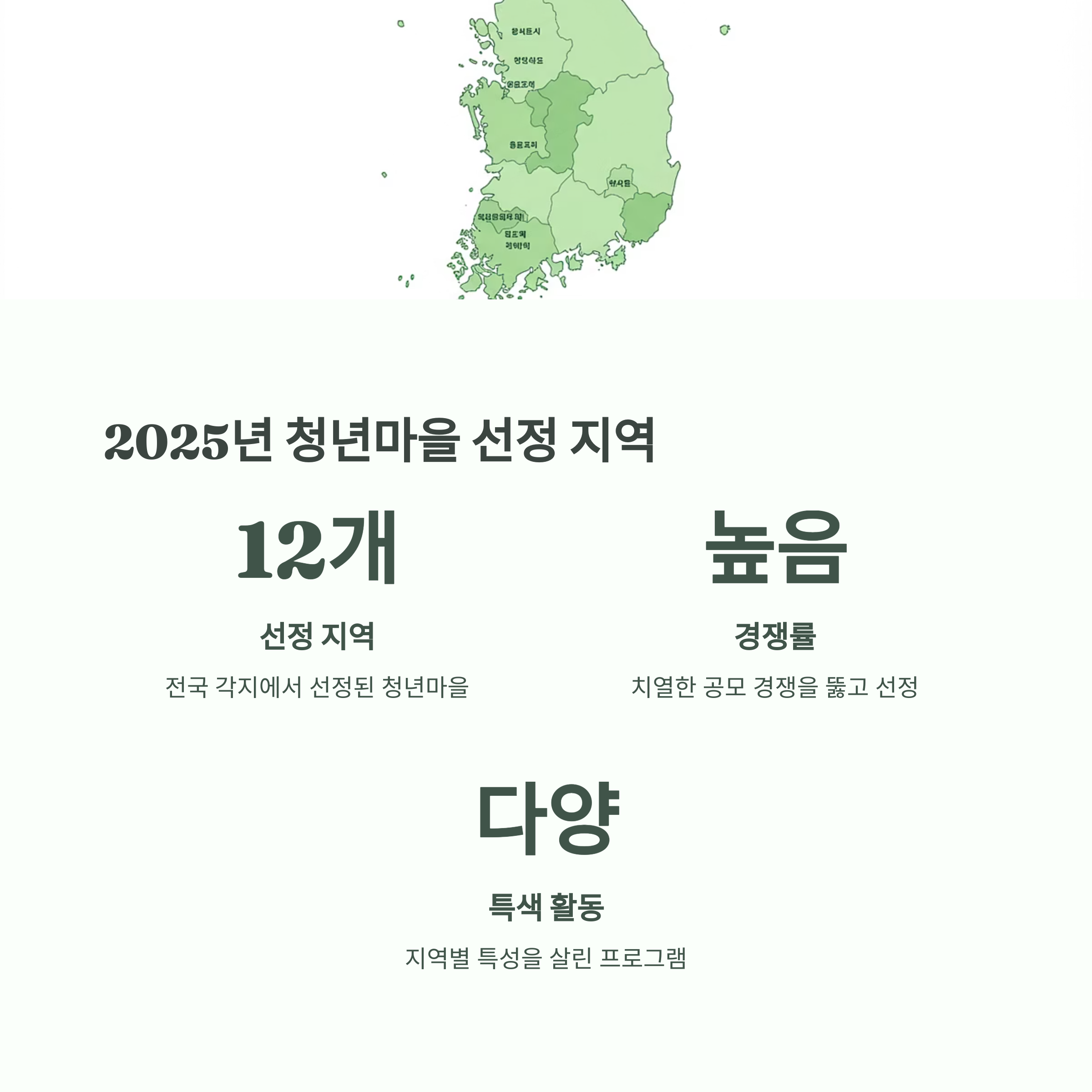 - 2025년 청년마을 만들기 신규 선정 지역: 12개소 (익산, 장수, 영암, 예산, 진천, 영천, 고령, 홍천, 광주, 고흥, 홍성, 보은)