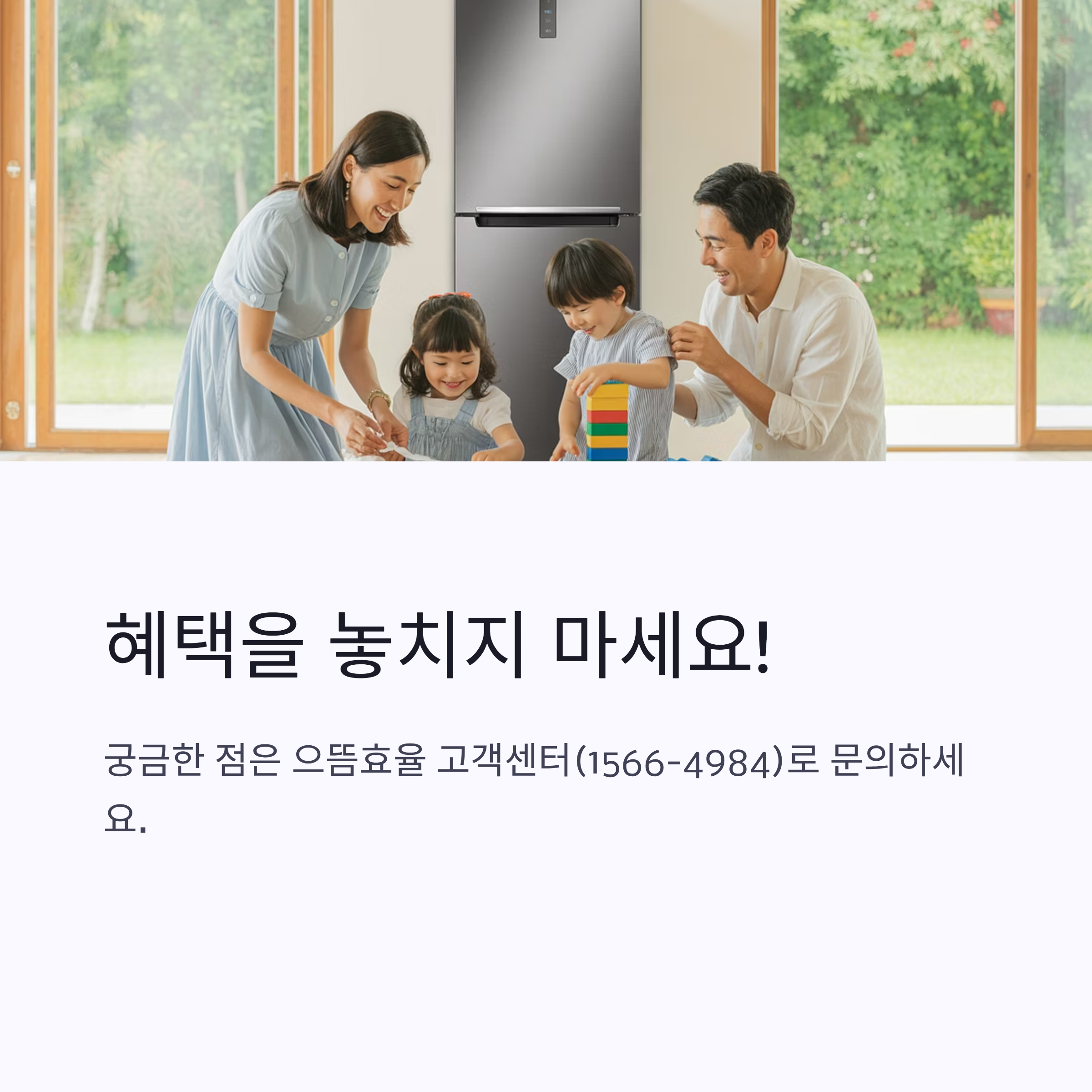궁금한 점은 으뜸효율 고객센터(1566-4984)로 문의하면 상세한 안내를 받을 수 있습니다. 이 기회를 놓치지 마시고 꼭 혜택을 챙기시길 바랍니다!