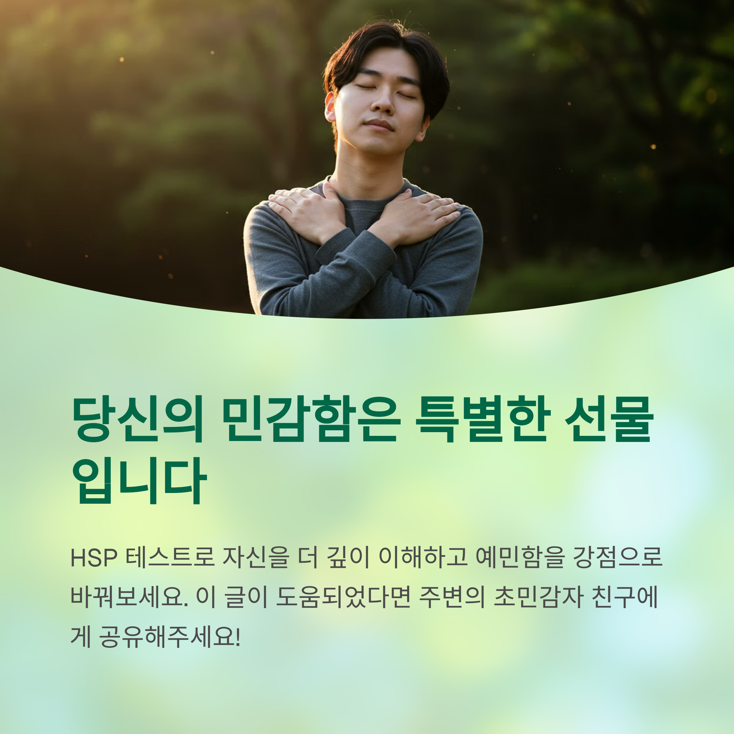 - 긍정적인 자기 대화: '나는 예민해서 힘들다'는 생각 대신, '나는 섬세하고 깊이 있는 사람이야'라고 스스로를 긍정적으로 바라봐주세요.