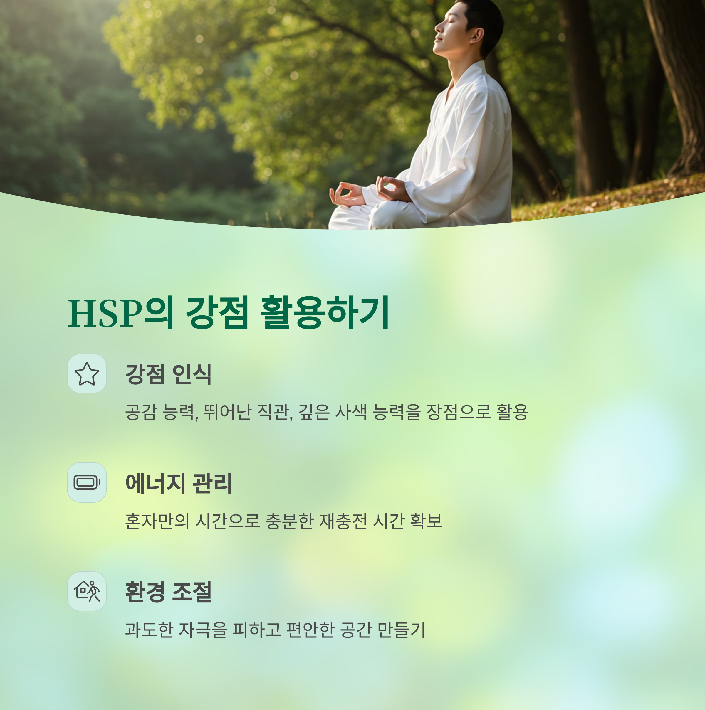 • 나의 강점 인식하기: 공감 능력, 뛰어난 직관, 깊은 사색 능력 등 나의 민감성에서 오는 긍정적인 면을 찾아보세요.
