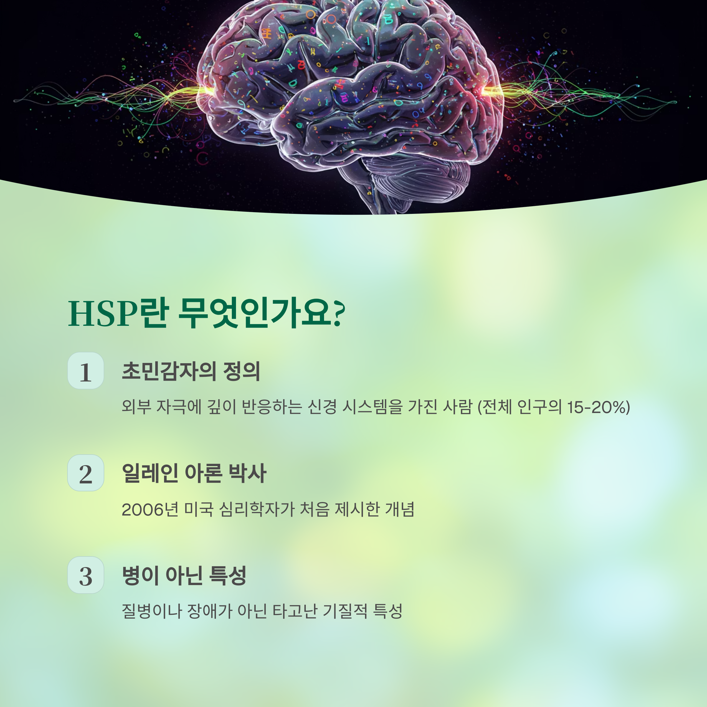 HSP는 크게 세 가지 주요 특성을 가지고 있다고 해요. 이 부분에서 정말 '아, 이거 완전 난데!' 하는 생각이 드실 수도 있어요.