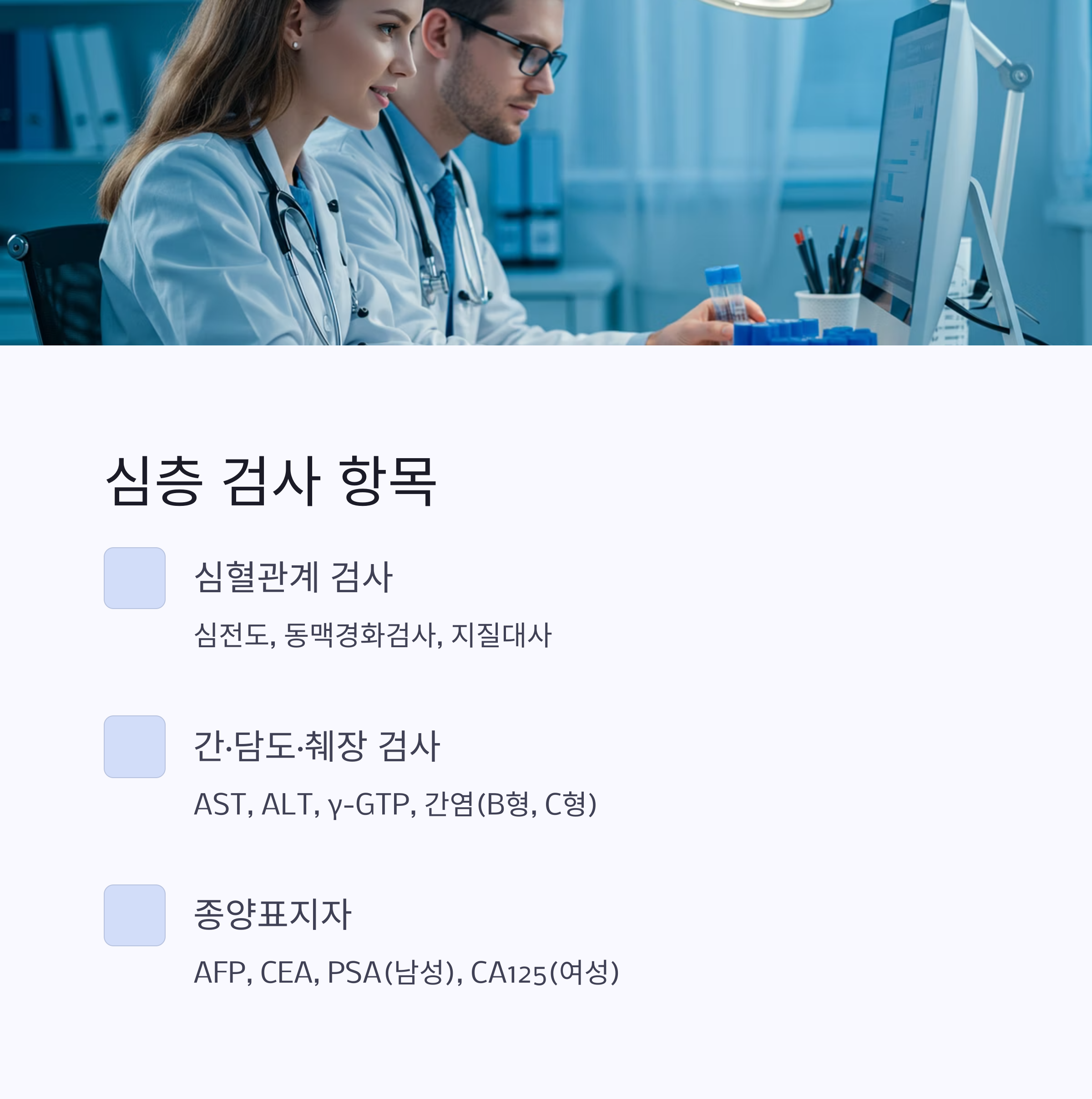 - 간·담도·췌장 검사: AST, ALT, γ-GTP, 간염(B형, C형), Amylase 등으로 주요 장기의 기능을 평가해요.