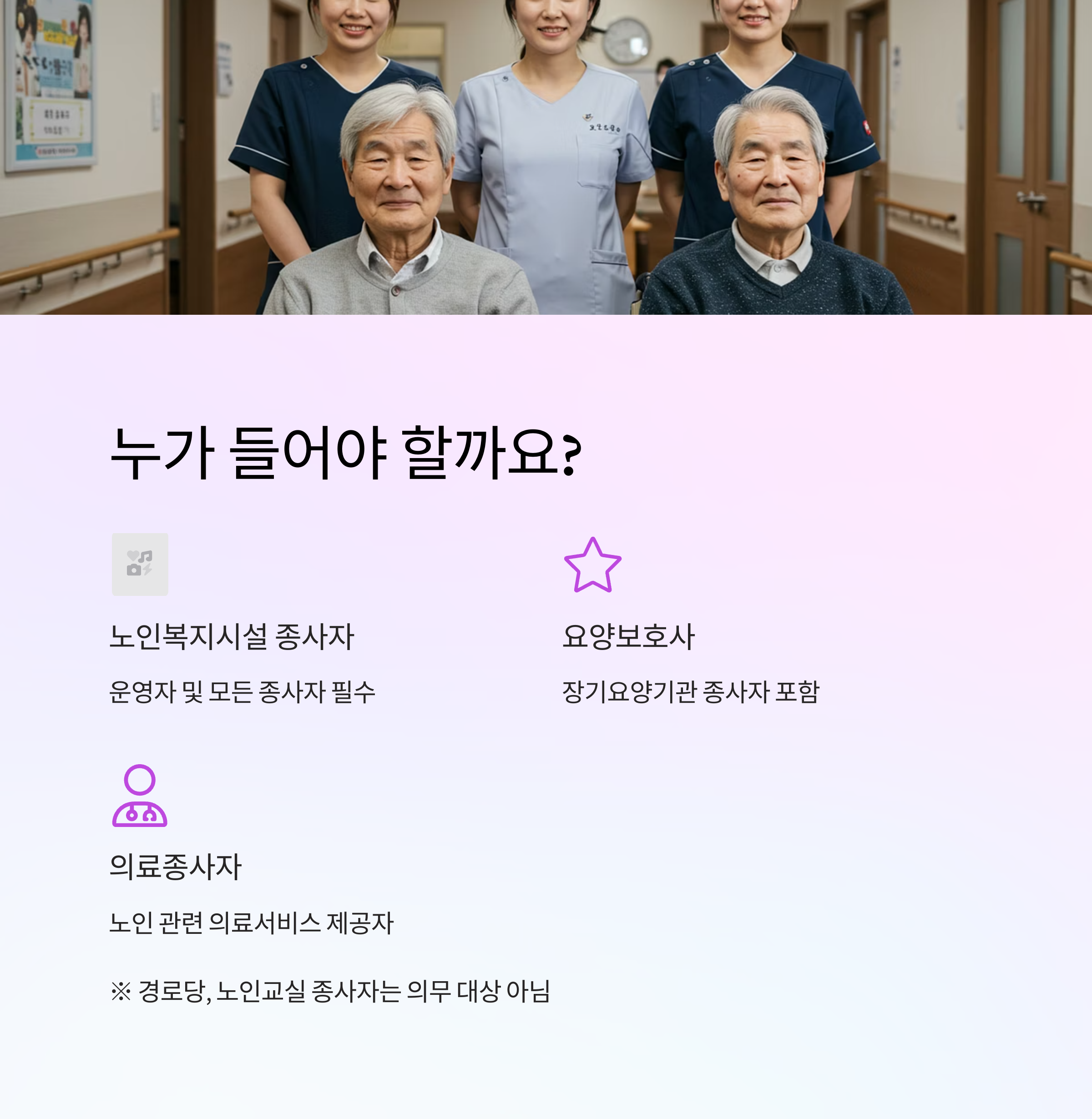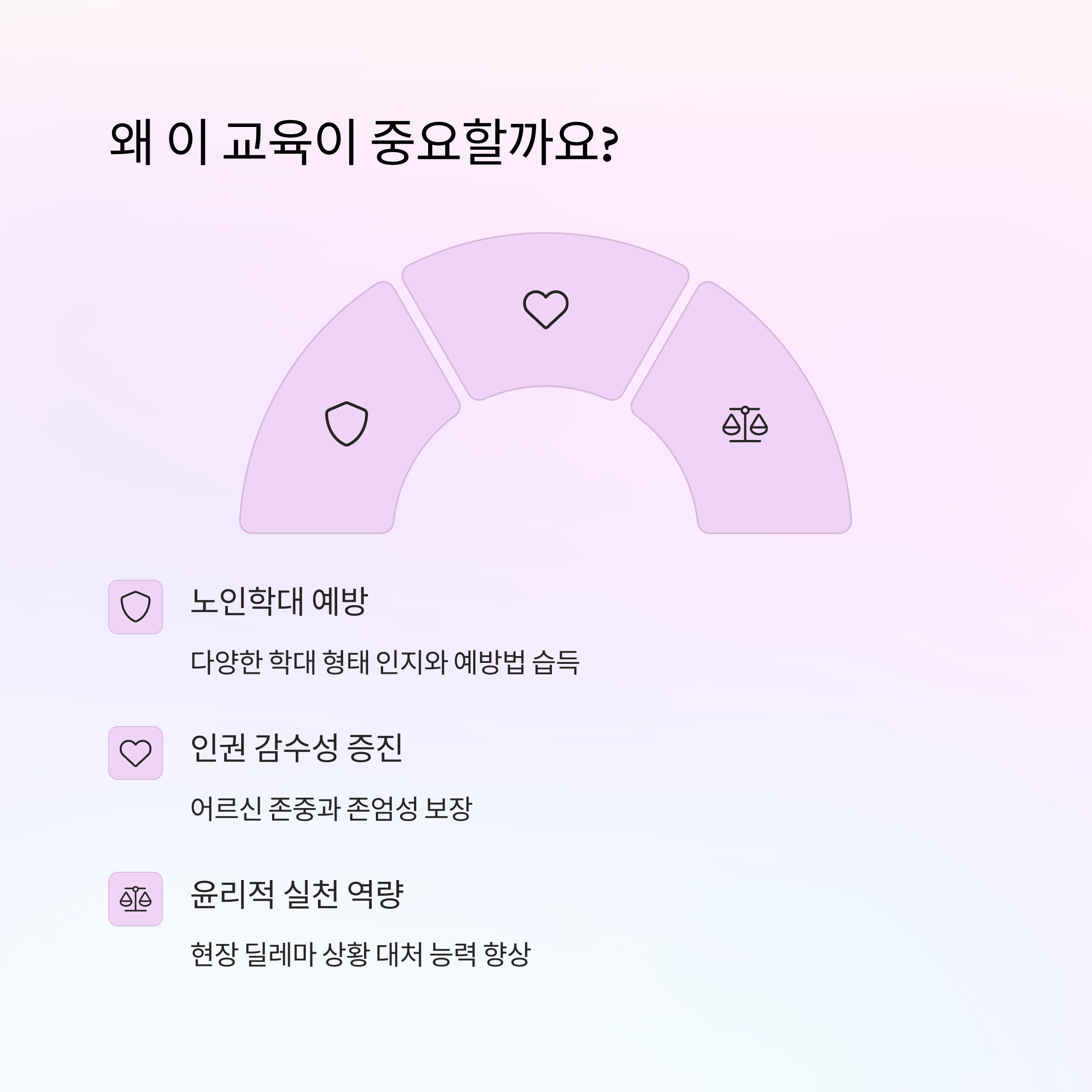 - 노인학대 예방: 교육을 통해 노인 학대의 다양한 형태를 인지하고 예방하는 방법을 배울 수 있어요.