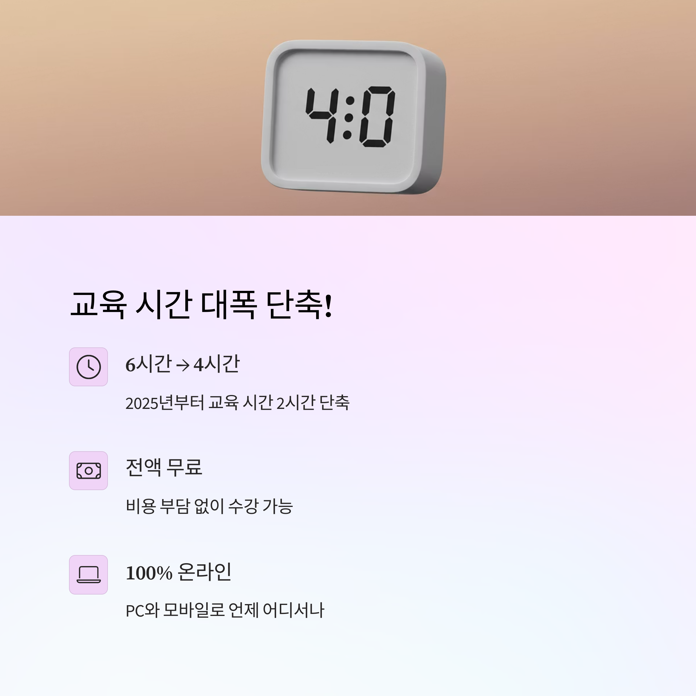 - ✅ 교육 시간 4시간으로 단축! 기존 6시간에서 대폭 줄어든 효율적인 학습.