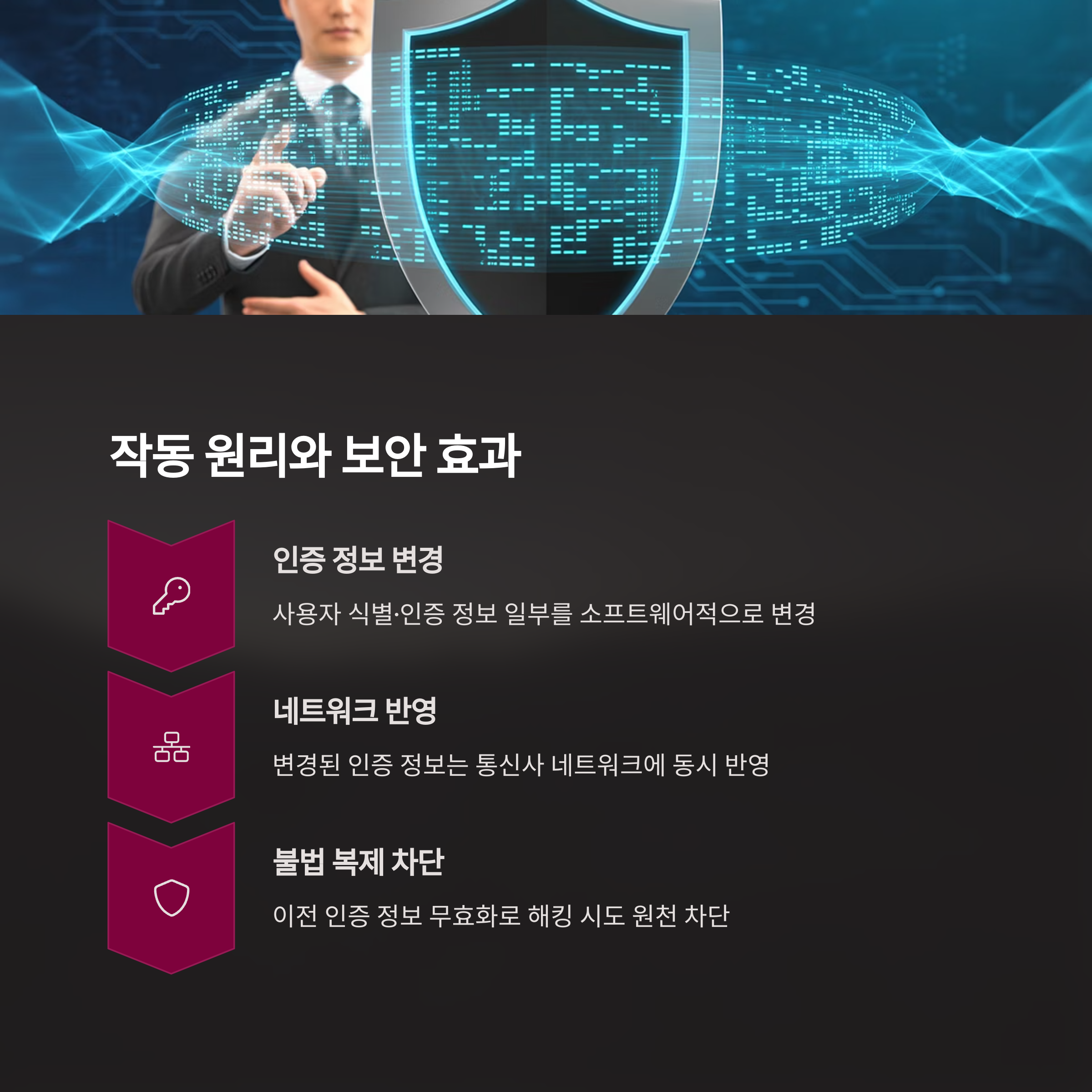 2. 이 솔루션은 실물 유심 교체 없이도 해킹·복제 위험을 원천적으로 차단하면서, 금융인증서·티머니·연락처 등 고객의 주요 정보를 그대로 유지할 수 있게 해줍니다.